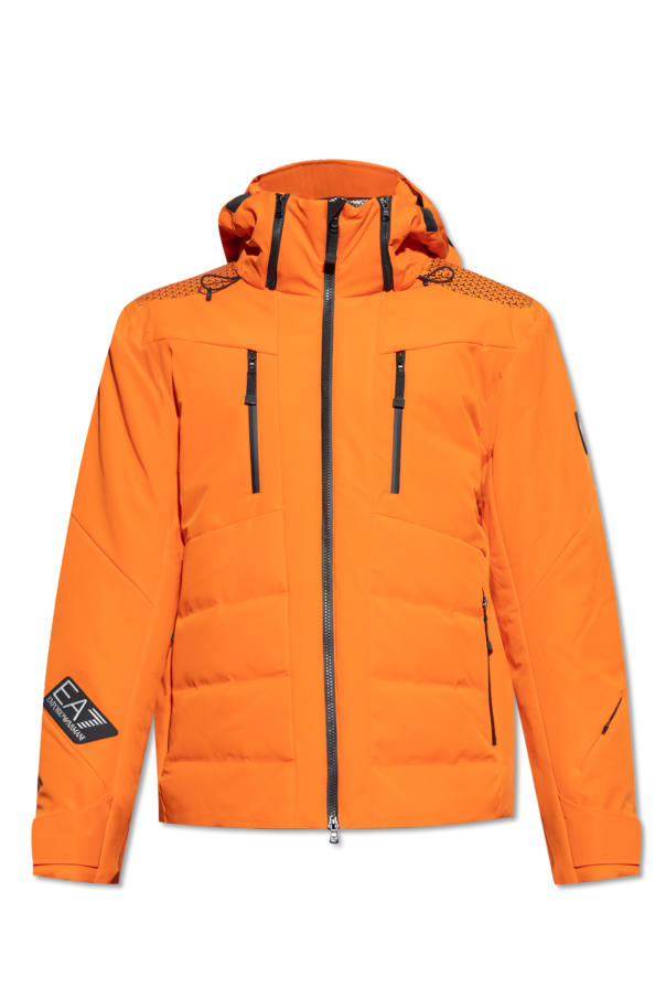 Orange ski jacket from EA7 Emporio Armani. Made of PROTECTUM7, a breathable four-way stretch fabric with glued seams combining exceptional waterproof and breathability properties. STRATUM7 RECYCLED padding consists of a special microfibre that comes entirely from recycling plastic bottles. The garment features black prints, a logo patch, reflective details for increased visibility, detachable drawstring hood with a visor, four zip pockets, long sleeves with a sleeve pocket, velcro cuffs and elasticated wrist gaiter with thumb holes as well as a drawstring hem and an internal snow belt with ribbed trims and snap fastenings.
