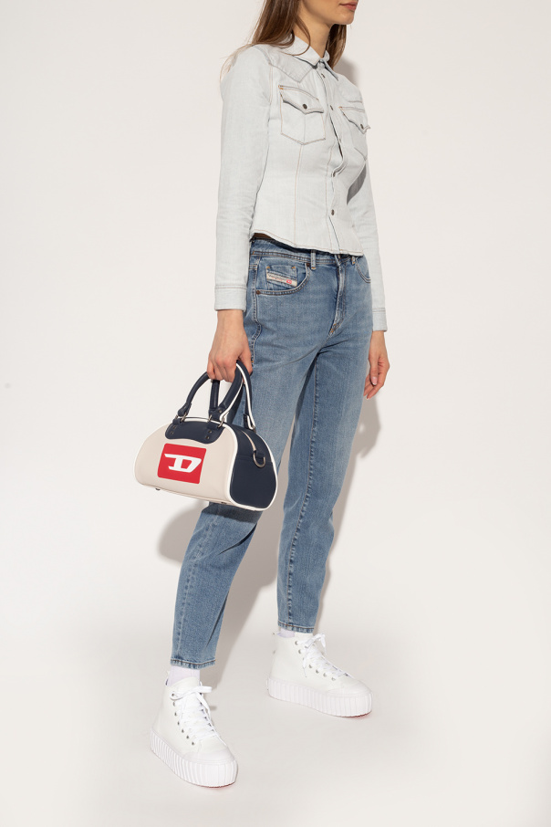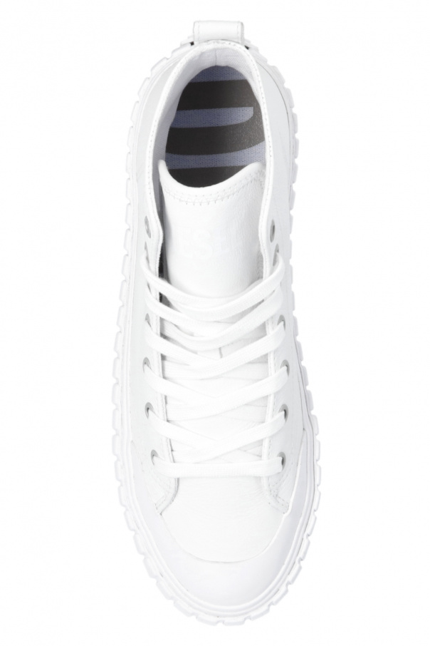 White ‘S-Hanami Mid’ lace-up sneakers from Diesel. Made of leather, this high-top design features a logo print and white rubber sole.