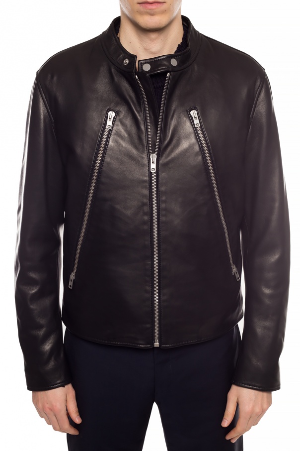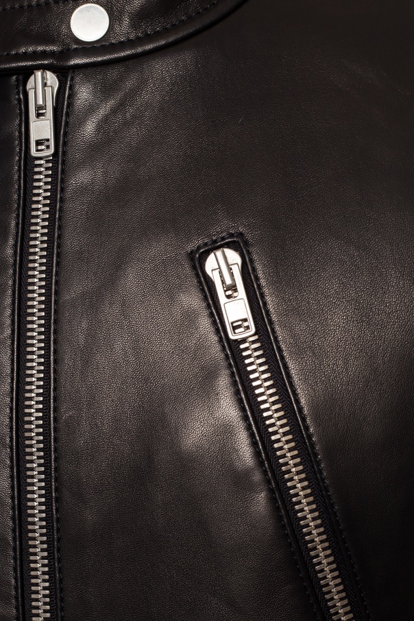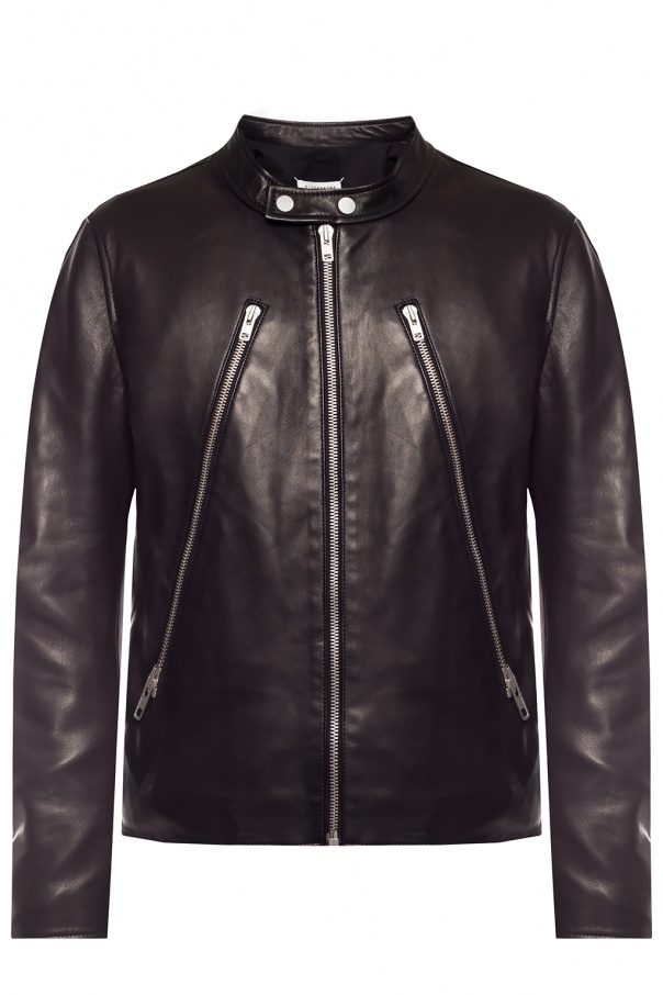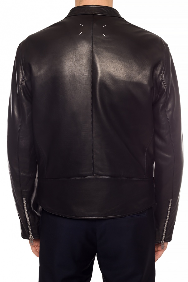 Black jacket from Maison Margiela. Made of leather. Zip and snap fastening. Two snap pockets on the front. Long sleeves. Silver-tone metal hardware.