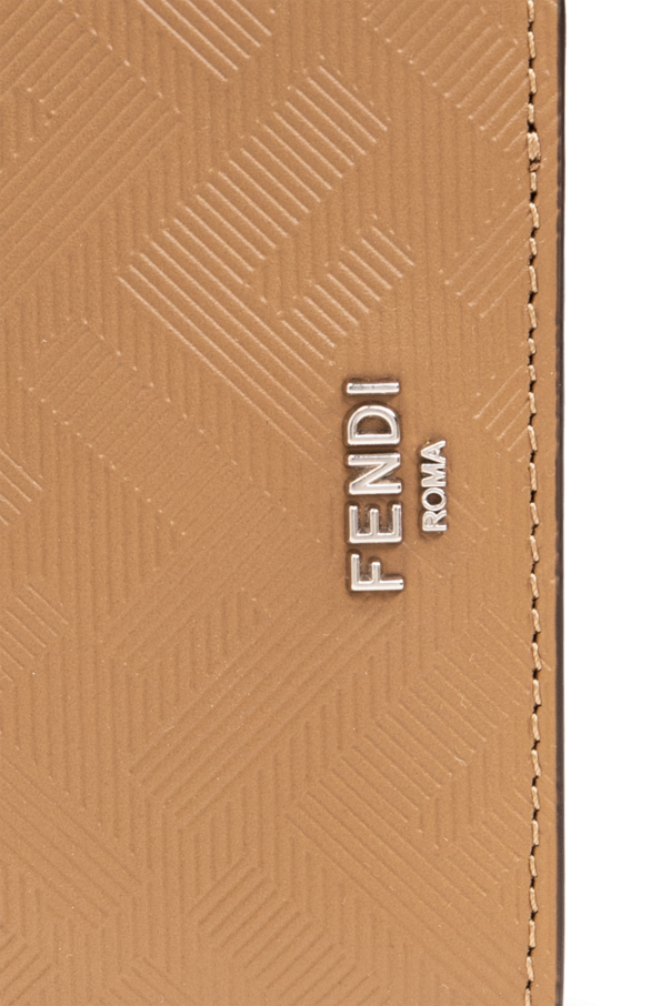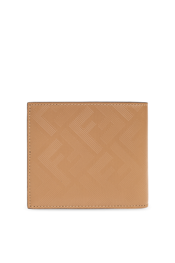 Brown bifold wallet from Fendi. Made of calf leather embossed with a monogram pattern, this item features a silver-tone metal logo detail and one internal compartment with two slip pockets and eight card slots.