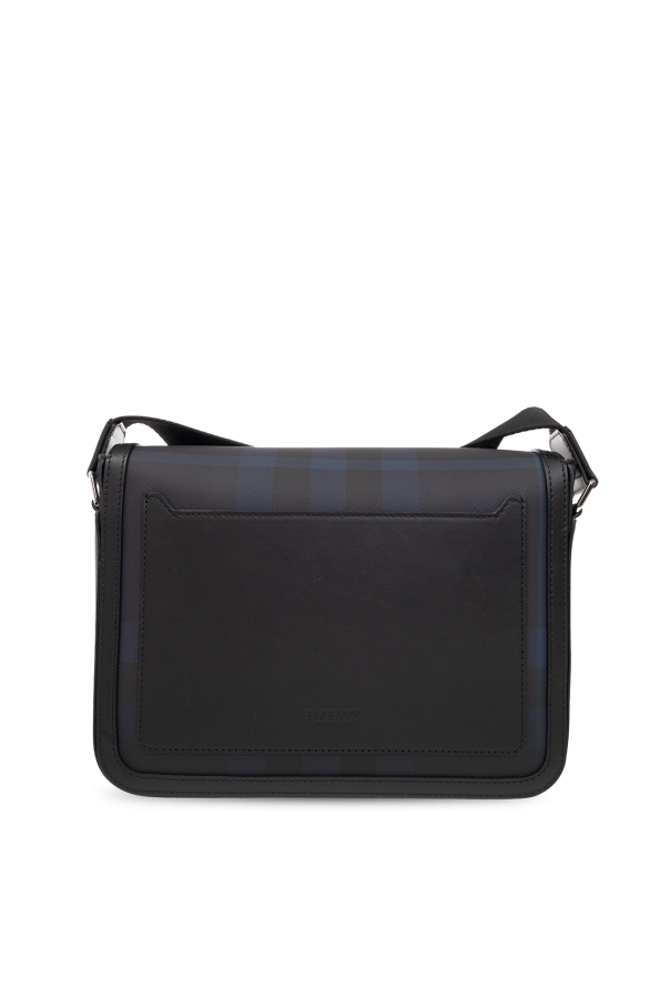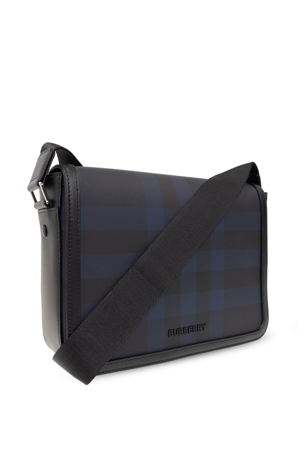 Black and navy blue ‘Alfred Small’ shoulder bag from Burberry. Made from coated canvas with a check pattern, this design secures with a magnetic fastener and features a logo plaque on the front, leather trims, one back slip pocket, one adjustable shoulder strap, silver-tone metal hardware and one internal compartment with a slip pocket.