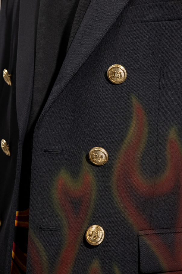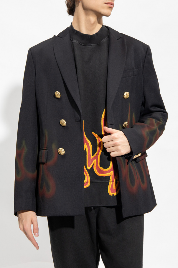 Black double-breasted blazer from Palm Angels. Made of a wool blend, this design features button fastenings, red and dark green flames print, two flap pockets, one slip pocket, peak lapels and long sleeves with buttoned cuffs.
