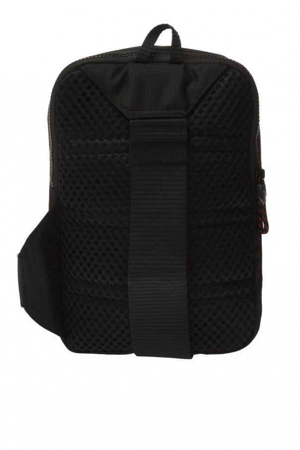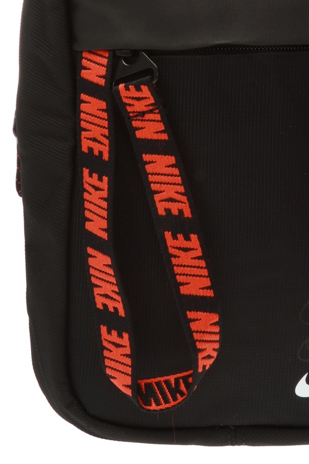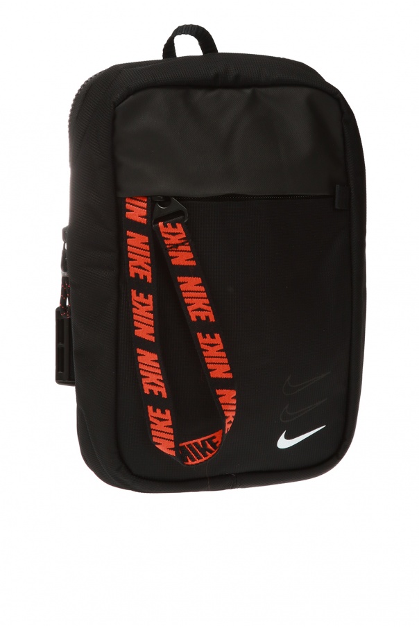 Black one-shoulder backpack from Nike. Zip fastening. White logo print and a pocket fastened with a zip featuring an orange and black element on the front. Back trimmed with mesh. Adjustable ribbed shoulder strap. Black lining. One compartment and a slip pocket inside.