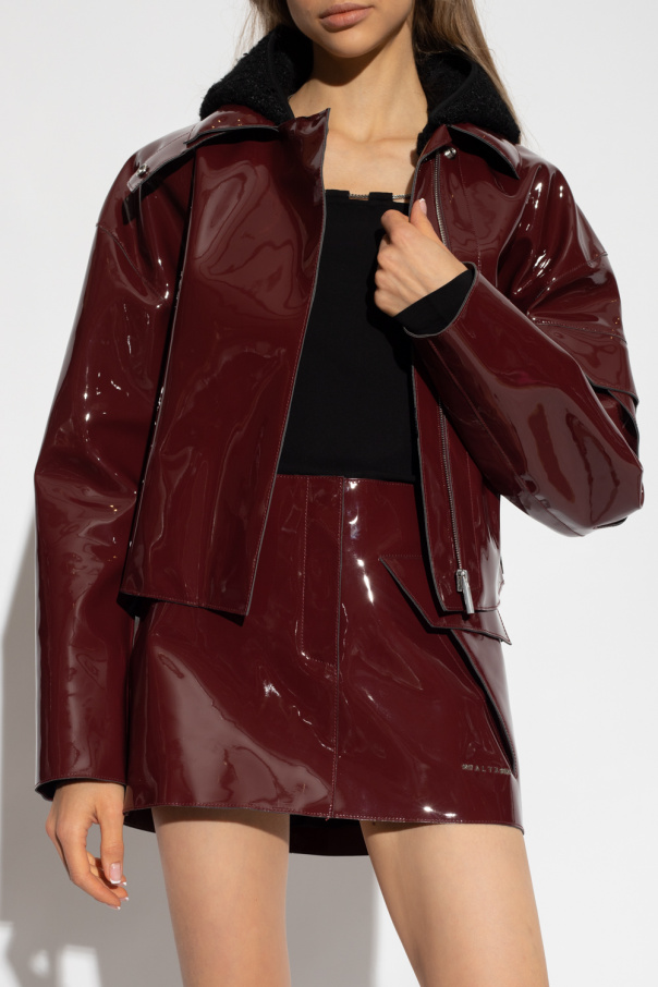 Maroon jacket from 1017 ALYX 9SM. Made of coated fabric, this garment features a zip and snaps with a concealed placket, black detachable hood, two front pokets, long sleeves with a flap pocket, silver-tone metal appliqués and detachable wide belt.