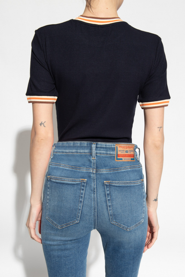 Navy ‘Jazz’ T-shirt from Wales Bonner. Made of organic cotton, this design features a cream logo embroidery and ribbed trims at the crew neck and cuffs in brown, cream and orange.