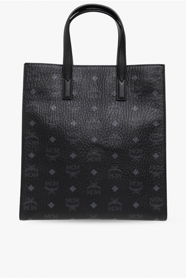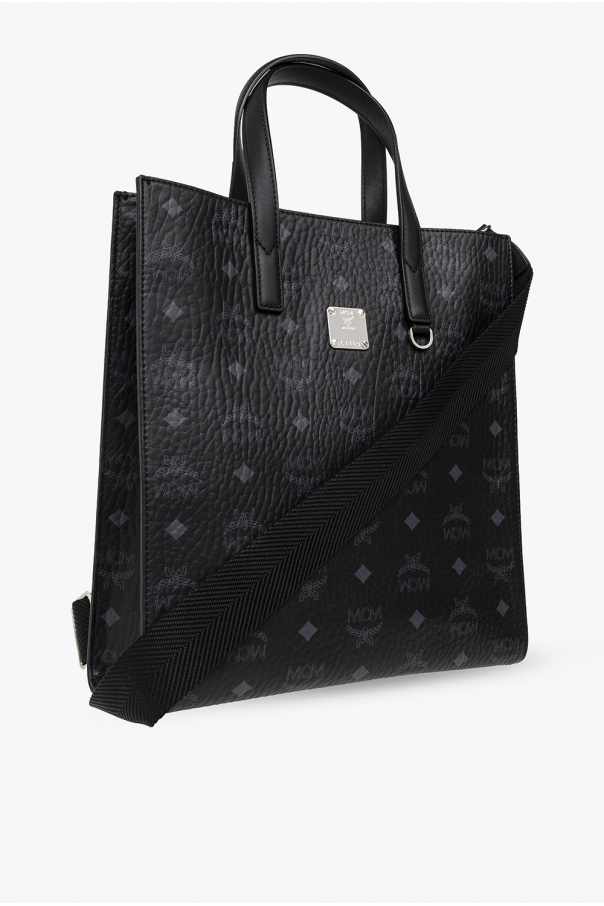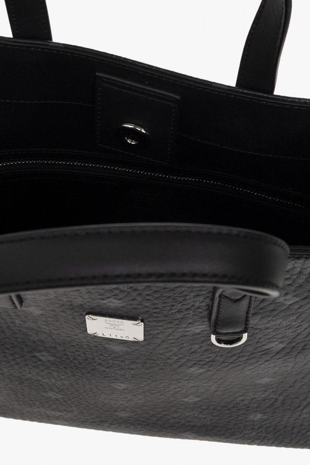Black ‘Aren Small’ shopper bag from MCM. Crafted with the brand's signature ‘Visetos’ canvas and trimmed with calf leather, this design features a snap fastening, metal application with an engraved logo on the front, two half-round handles, a detachable and adjustable shoulder strap, silver-tone metal hardware and one internal compartment with two slip pockets and one zip pocket.