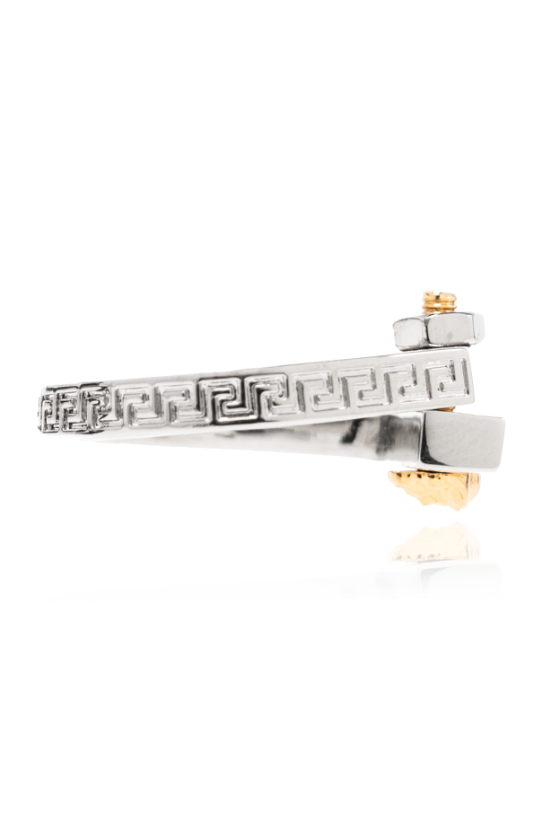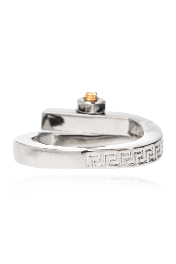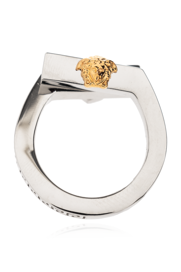 Silver-tone ring from Versace. Made of metal, this item showcases the brand's signature application with a gold-tone Medusa face.