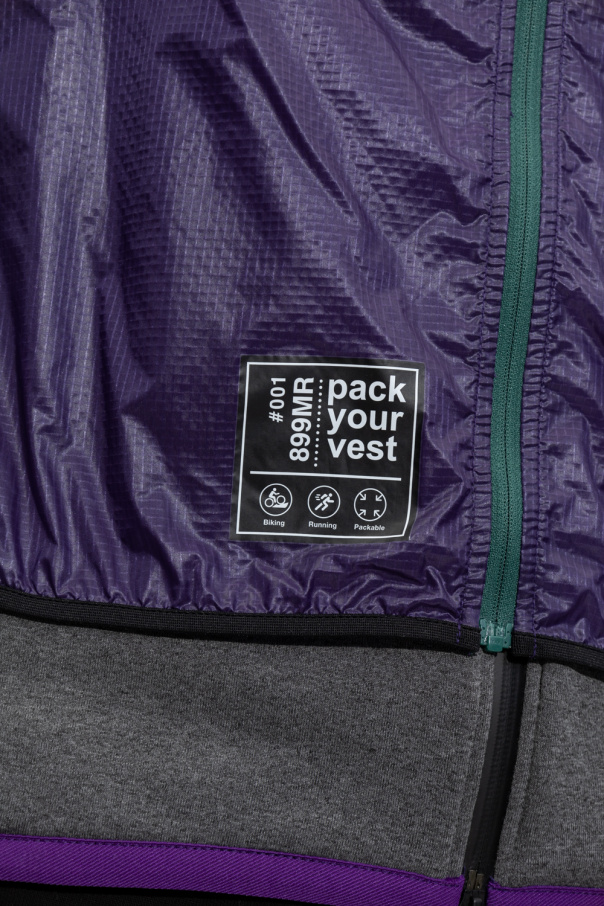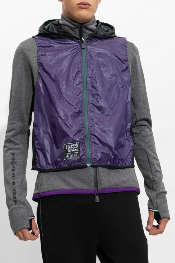 Apparel set from Moncler Grenoble, the ‘Moncler Grenoble Day-Namic’ collection. Grey, purple and black sweatshirt has a zip-up collar, a printed logo, two zip pockets and long sleeves with elasticated cuffs and thumbholes. Purple and black vest is made of fabric panels and features a hood.