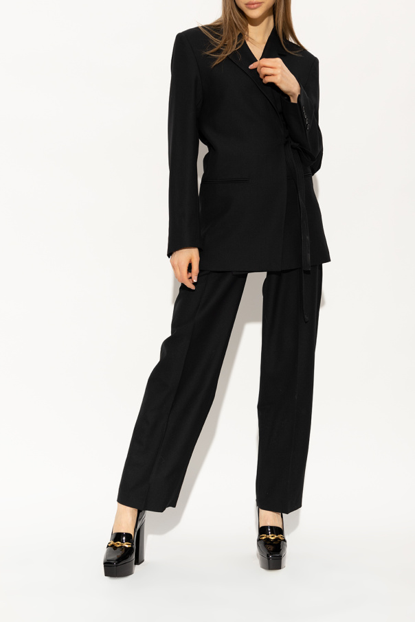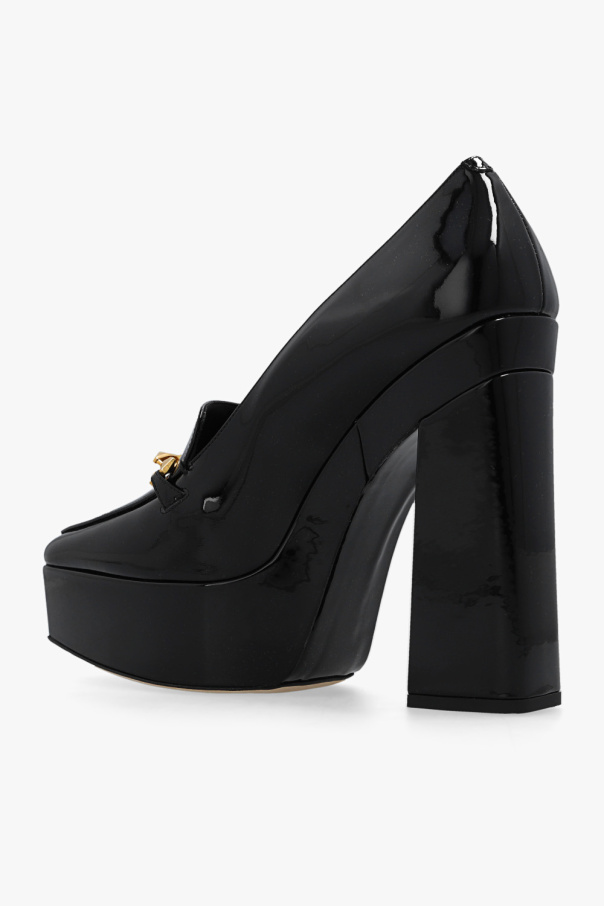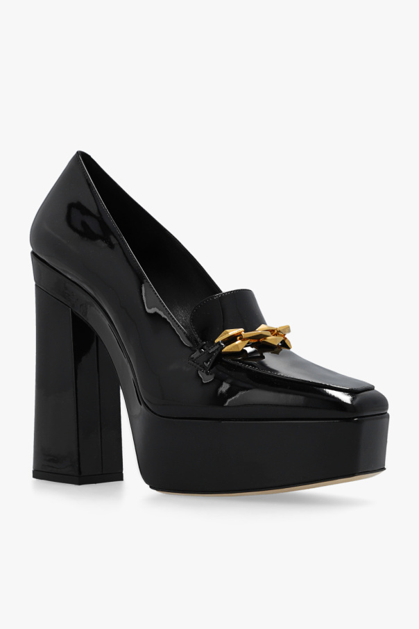 Black ‘Tilda’ platform shoes from Jimmy Choo. Made of patent leather, this pair features a gold-tone chain, square toe, block heel and light beige leather sole.