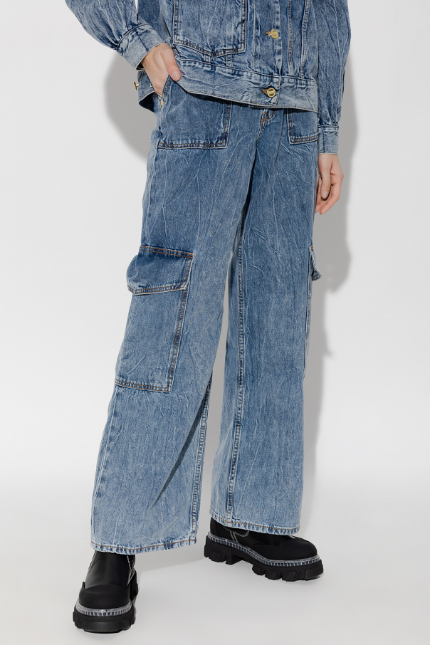 Blue cargo jeans with a vintage effect from Ganni. Made of organic wool, this pair features a zip and button closure, four slip pockets, two flap pockets and wide, straight legs.