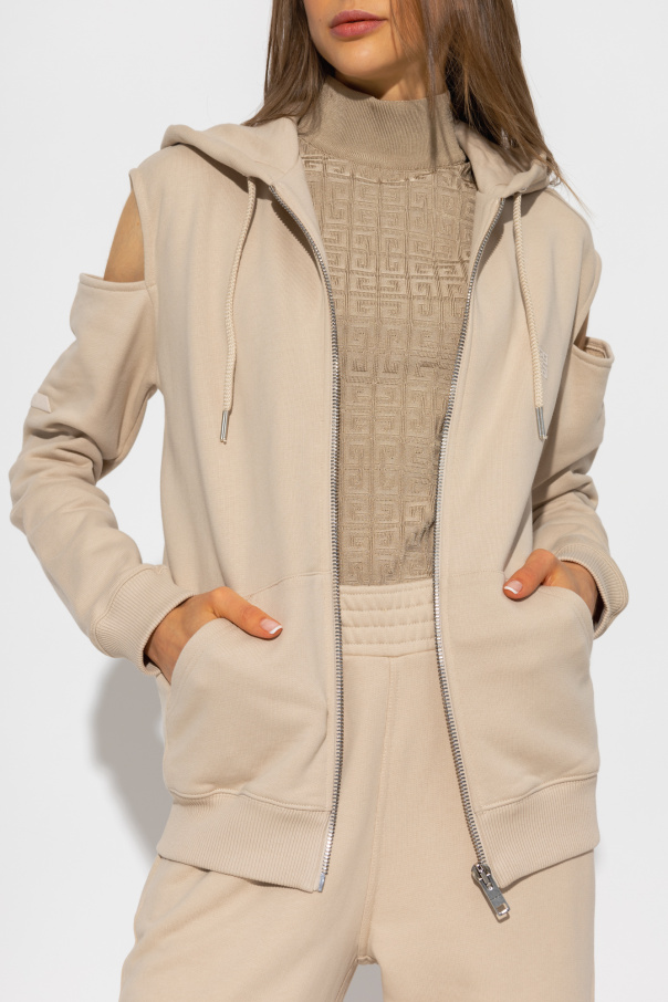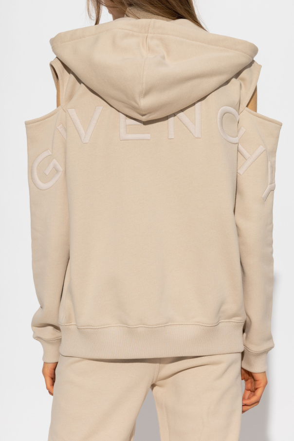 Beige hoodie from Givenchy. Crafted from cotton, this garment features a zip fastening, cut-outs, drawstring hood, logo embroidery, two front pockets and ribbed trims at the hem and cuffs.