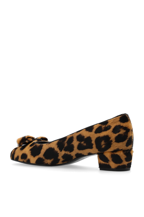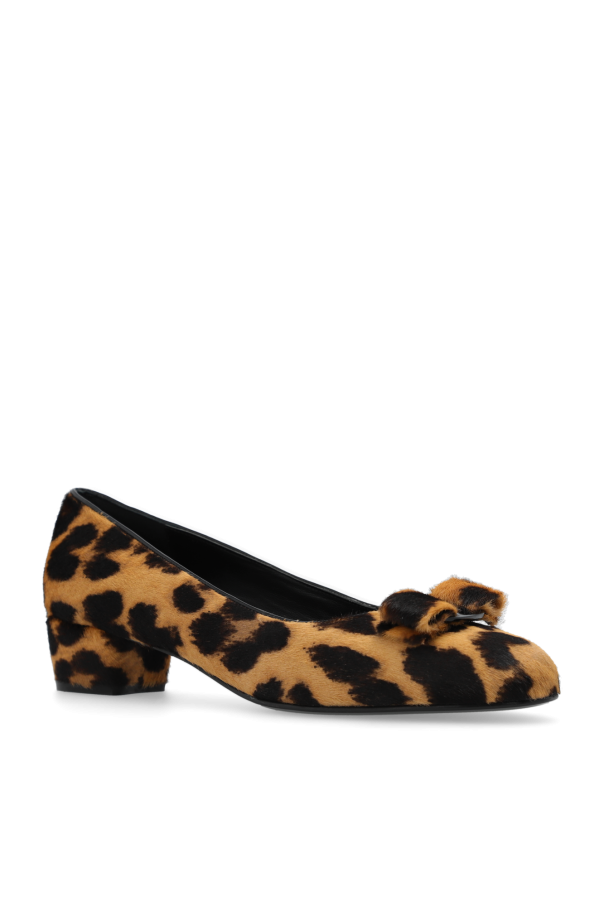 Beige and black ‘Vara’ pumps from FERRAGAMO. Made from leather and trimmed with animal-printed hair, this model sits on a black leather sole and features a standard footbed and a decorative application with an engraved logo on the front.