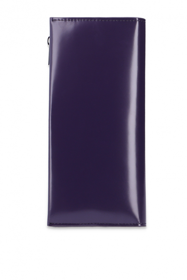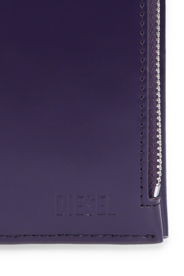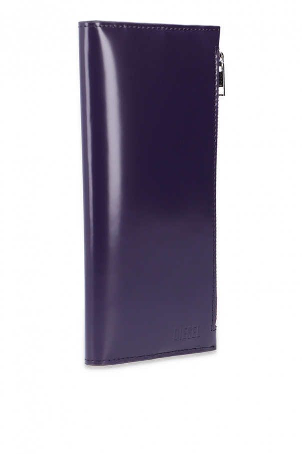 Purple wallet from Diesel. Crafted from cow leather, this item fastens with a snaps and is complete with a zipped coin pocket, purple and navy lining as well as two slip pockets and twelve card slots inside.