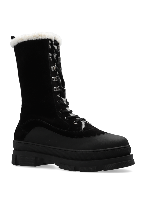 Black ‘Aldea’ snow boots from Jimmy Choo. Crafted from suede and leather with cream faux fur trims, this lace-up pair features a silver-tone metal logo detail and black rubber sole.