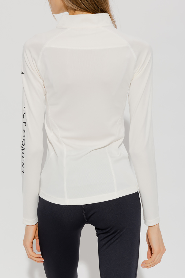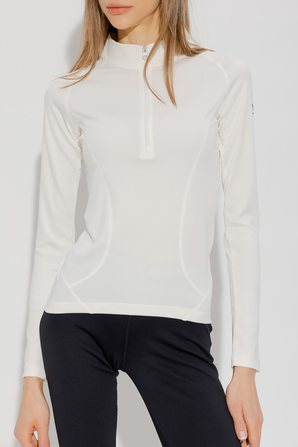 Cream thermal sweatshirt from Perfect Moment x Dede Johnston. Crafted with moisture-wicking material, this style features a standing collar with a half-zip closure and a printed black logo on the sleeve.