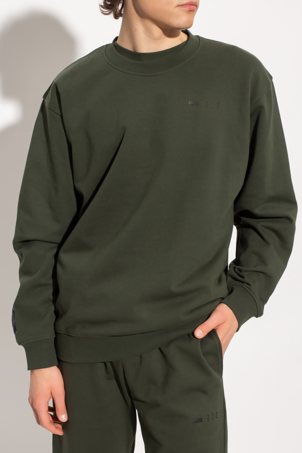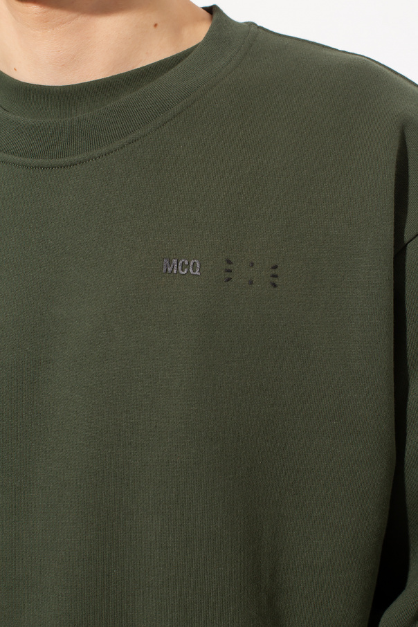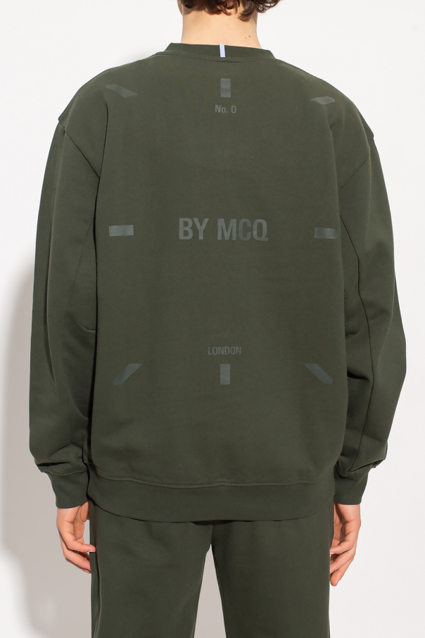 Dark green crewneck sweatshirt from McQ, the ‘No. 0’ collection. Made of cotton, this style features a black graphic pattern accompanied by a patch and ribbed trims on the collar, bottom hem and cuffs.