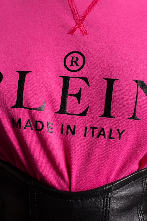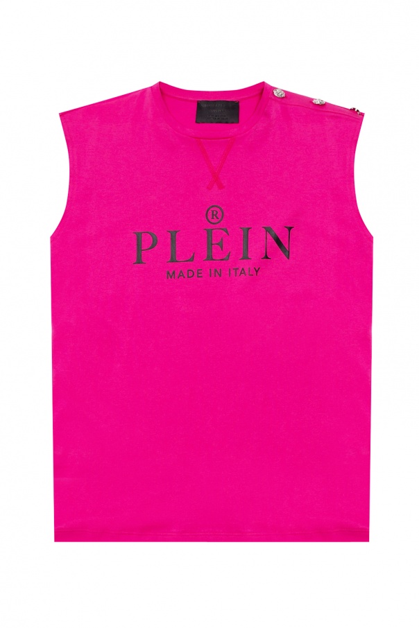Pink sleeveless T-shirt from Philipp Plein. Crafted from cotton, this design features a printed logo pattern in black, decorative buttons on the shoulder, ribbed round neck and a raw cut edge.