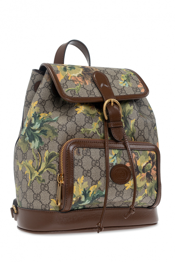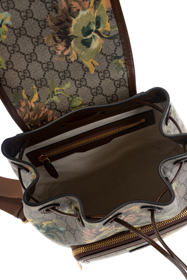 Beige and brown backpack from Gucci. Made of GG Supreme canvas backpack with brown leather trims, this garment features a magnetic snap and drawstrings fastening, floral print, front zip pocket with a logo detail, adjustable shoulder straps, gold-tone metal hardware and one internal compartment with one zip pocket.