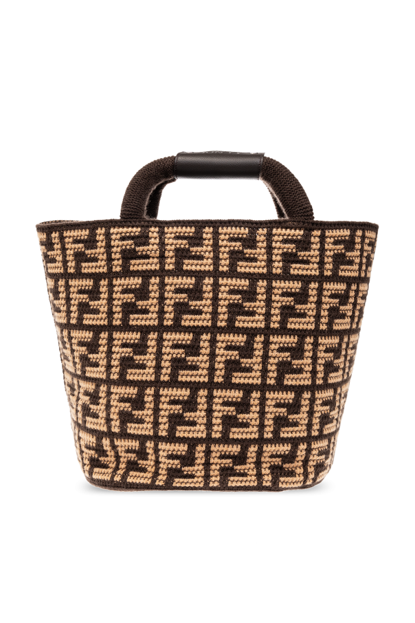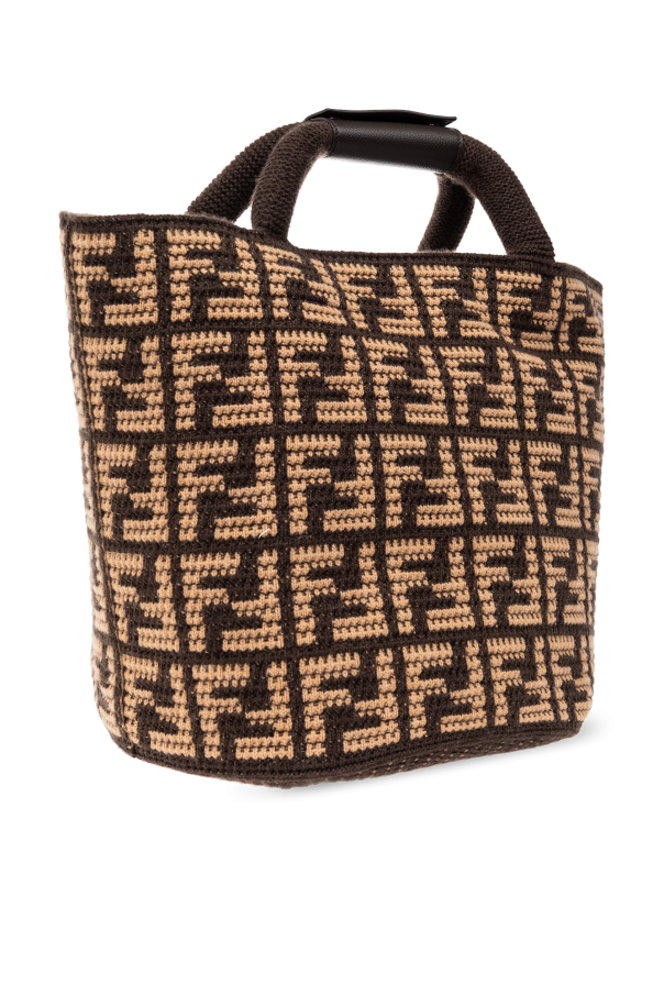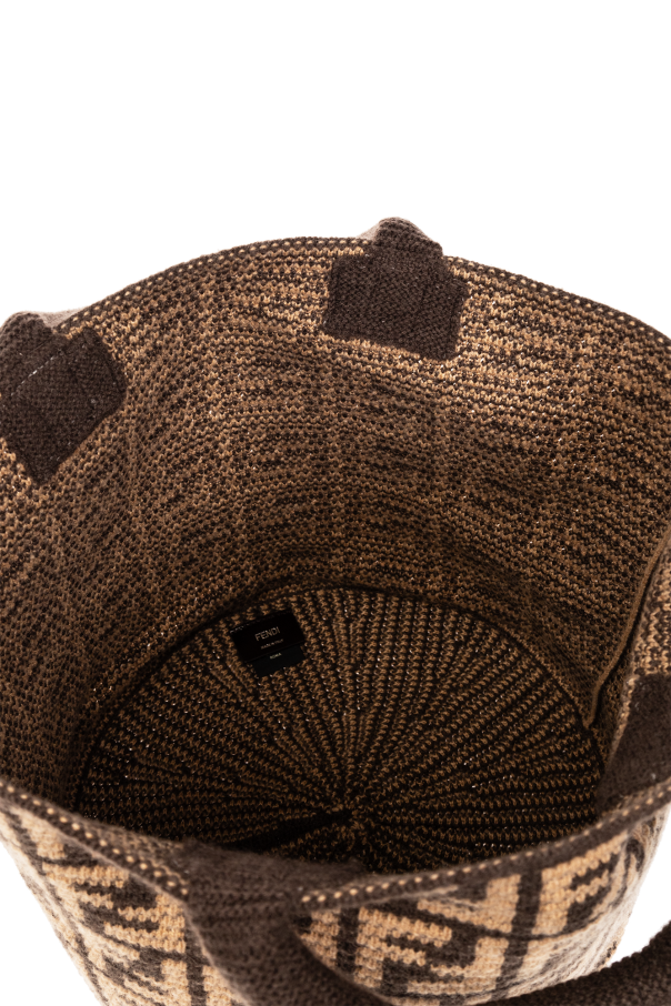 Brown shopper bag from Fendi. Made of cashmere and decorated with a monogram pattern, this design features two handles connected via a logo-embossed strap with snap closures and one internal compartment.