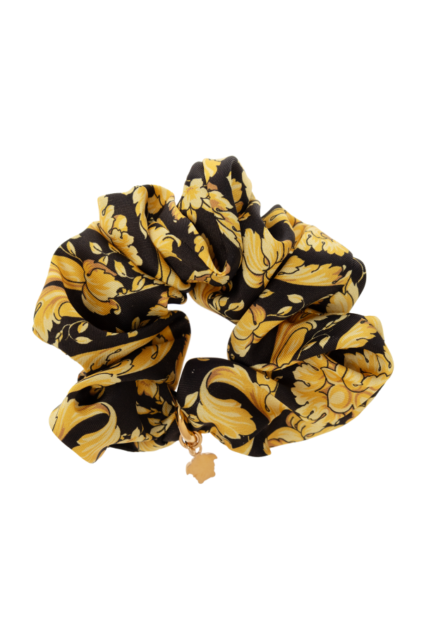 Black scrunchie from Versace. This item is embellished with a yellow and brown Barocco pattern and a gold-tone metal ring with a Medusa face pendant.