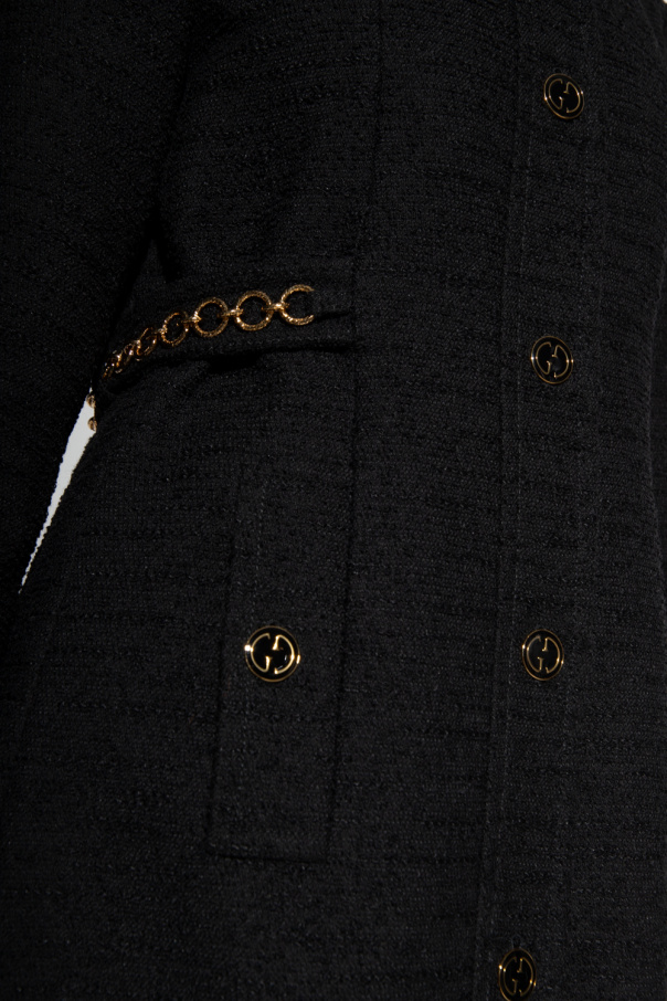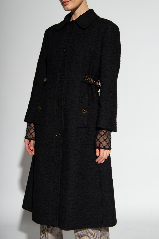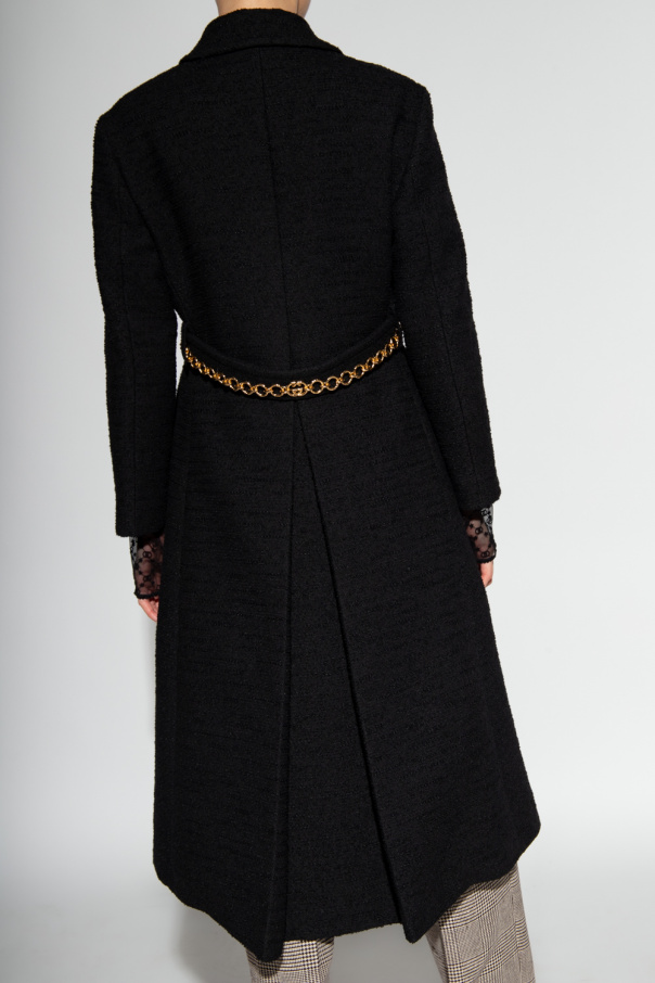 Black tweed coat from Gucci. Made of a blend of cotton, wool and lama, this garment is complete with button fastenings, waist belt with gold-tone chain inserts, decorative pleat at the back, two buttoned pockets and long sleeves.