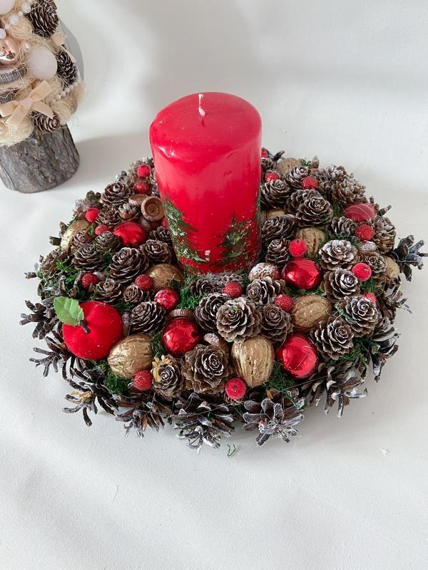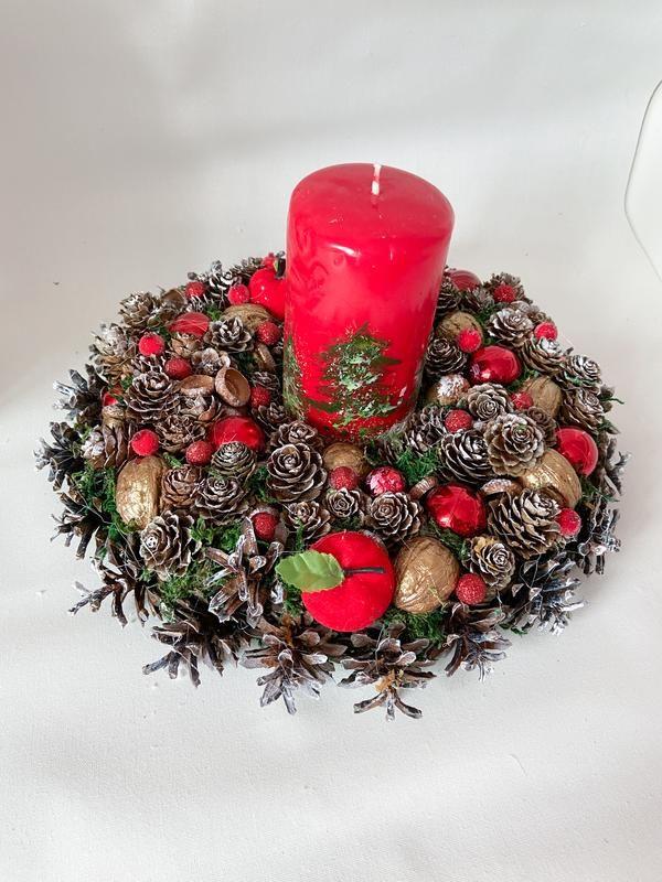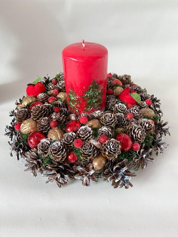 Різдвяний підсвічник зроблений в класичній кольоровій гаммі. Використанням природних матеріалів, пластикових куль, оксамитових яблук .