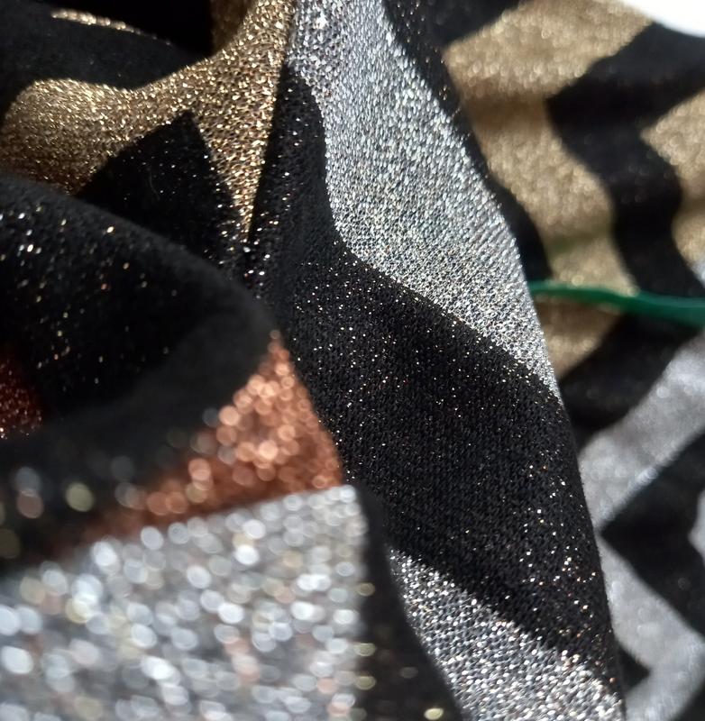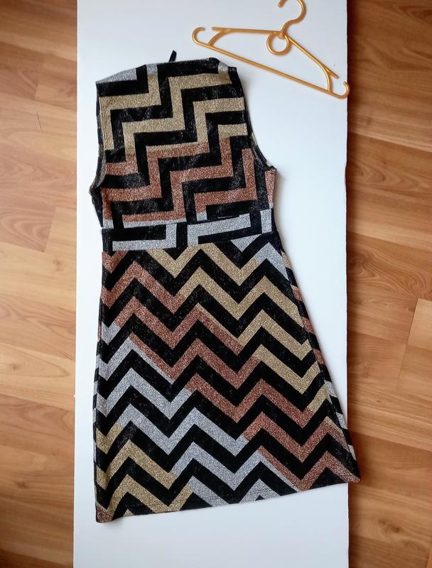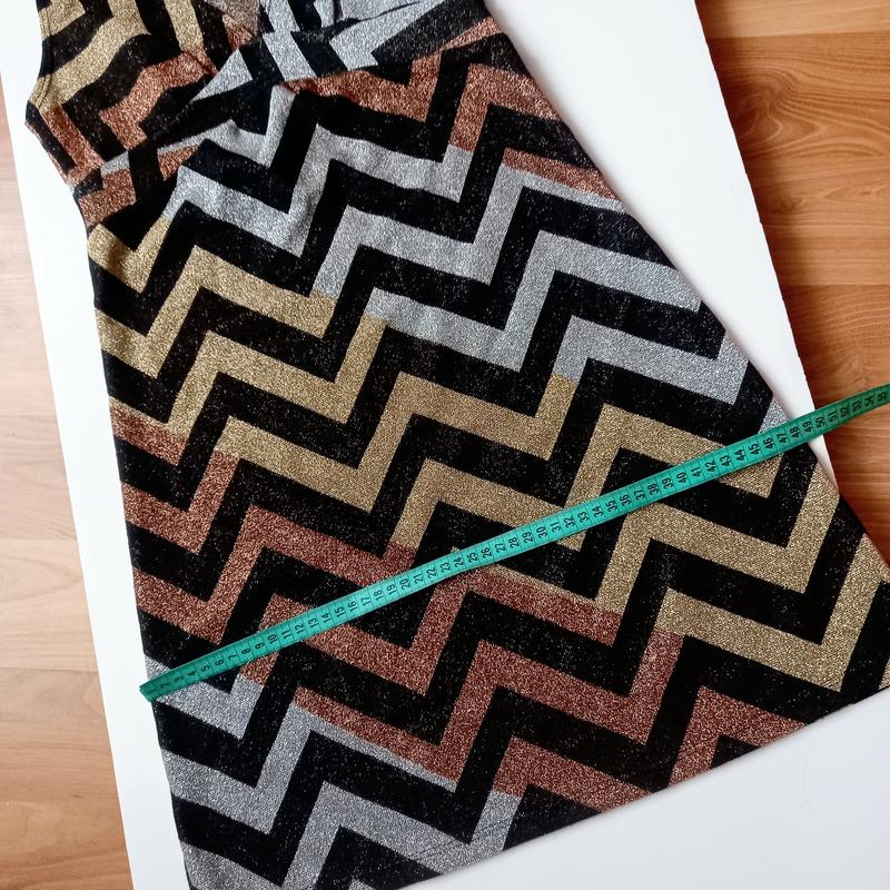 Створює легкий, звабливий образ. Плаття невагоме, майже не відчуваєш на тілі. Трикотаж добре тягнеться, дуже еластичний. Три види блиску: золото, срібло, бронза. Крупний контрастний зигзаг освіжає. Розмір S, заміри на фото, підійде і на М. Ліф зі зборками, на бюст до 90 см. Бретелі від білизни не виглядатимуть. Новий стан, жодних зауважень.