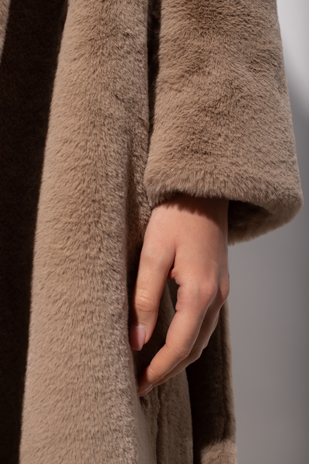 Taupe coat from Proenza Shoulder White Label. Crafted from faux fur, this garment is characterized by notch lapels, a tie belt, two front pockets and a single rear vent.