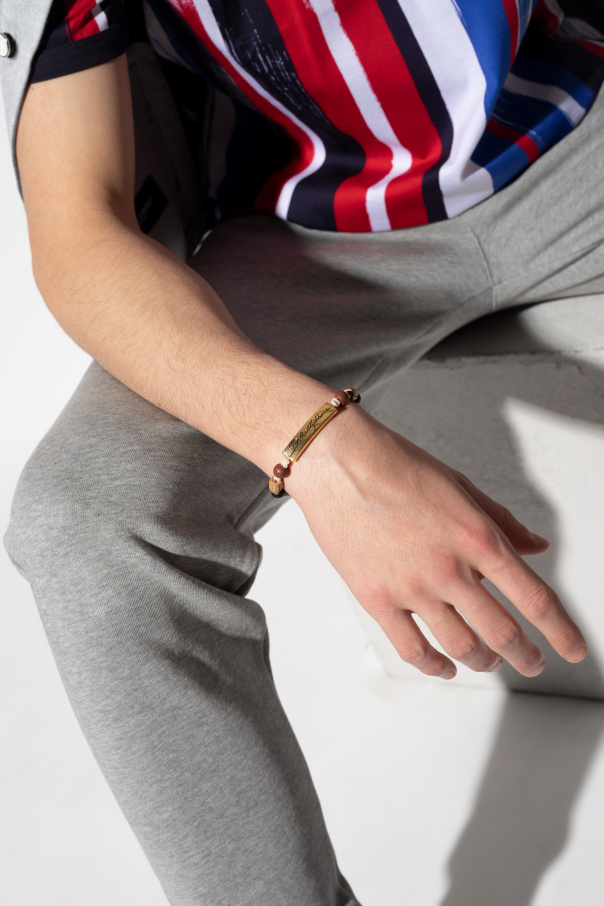 Beige bracelet from Dolce & Gabbana. This design features round wood elements in brown and black as well as a logo-embossed brass detail in gold-tone.