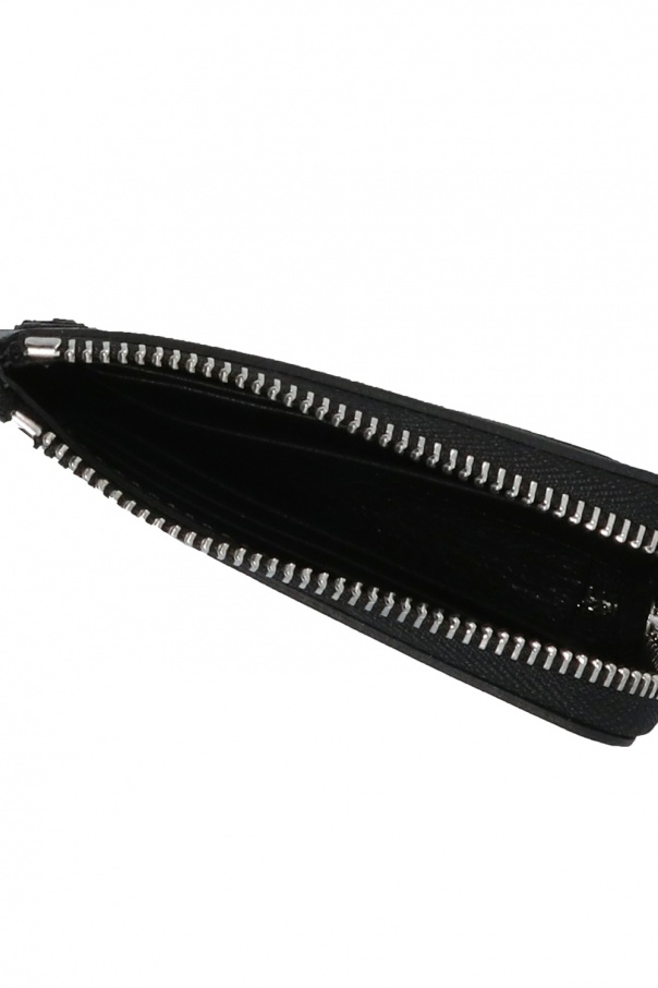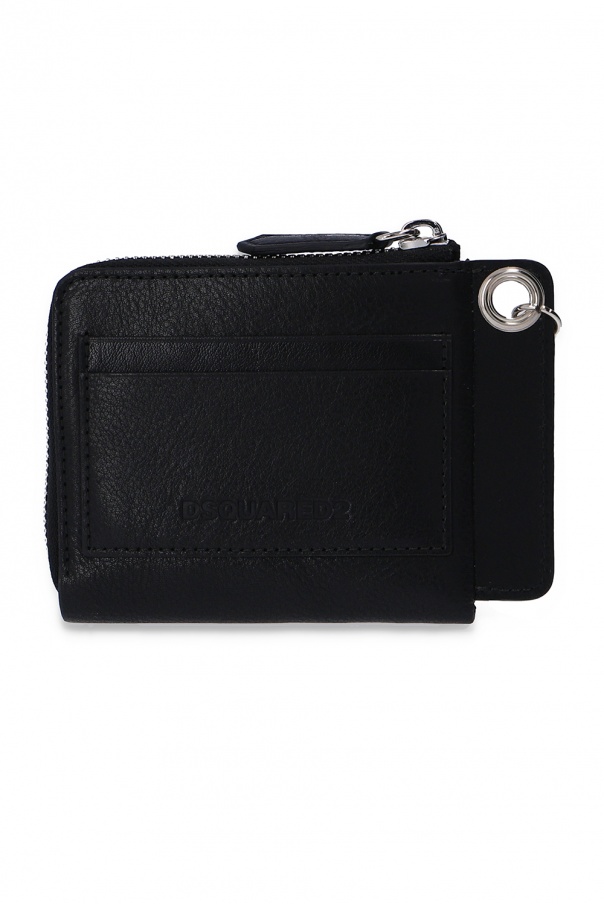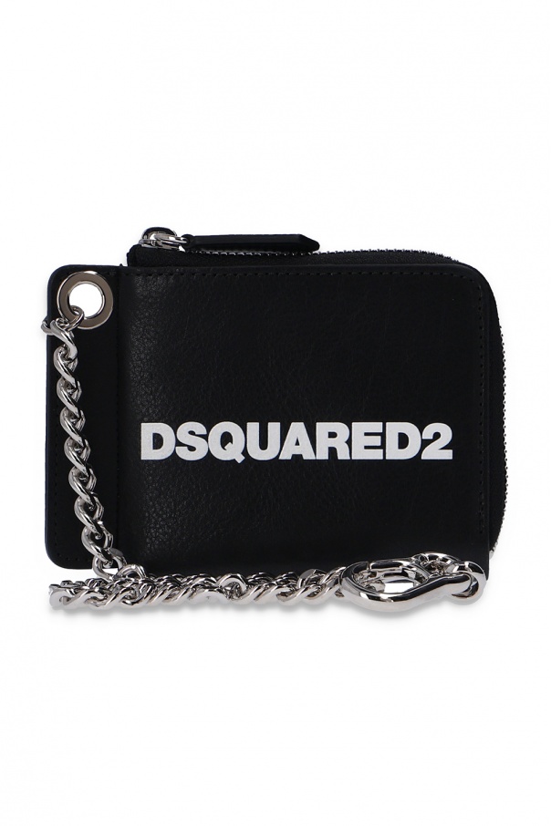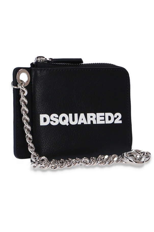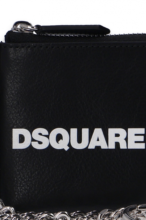 Black card holder from Dsquared2. Crafted from leather, this accessory features a zip fastening, white logo print, chain with a snap hook and one main internal compartment with three card slots.
