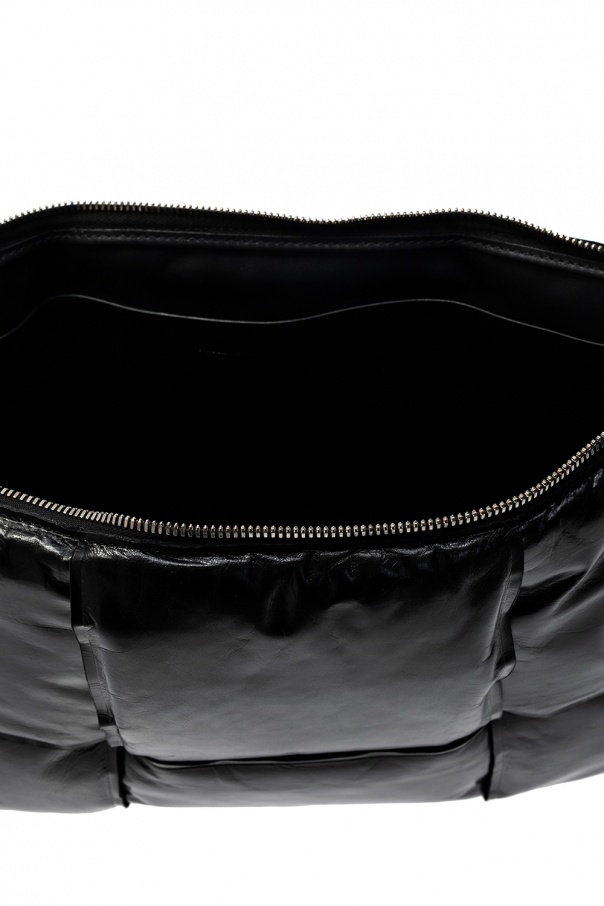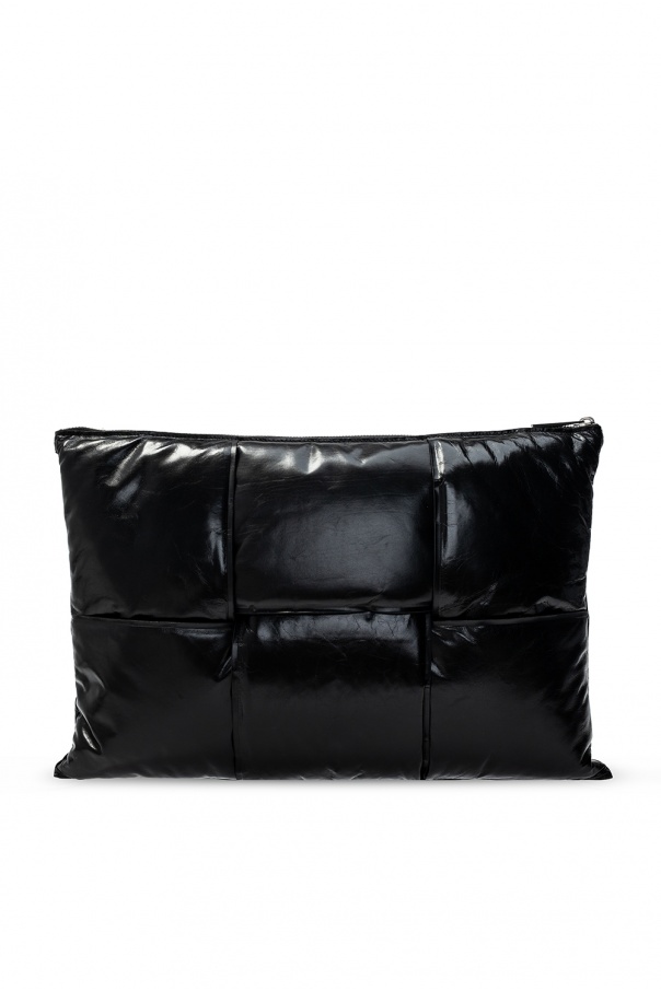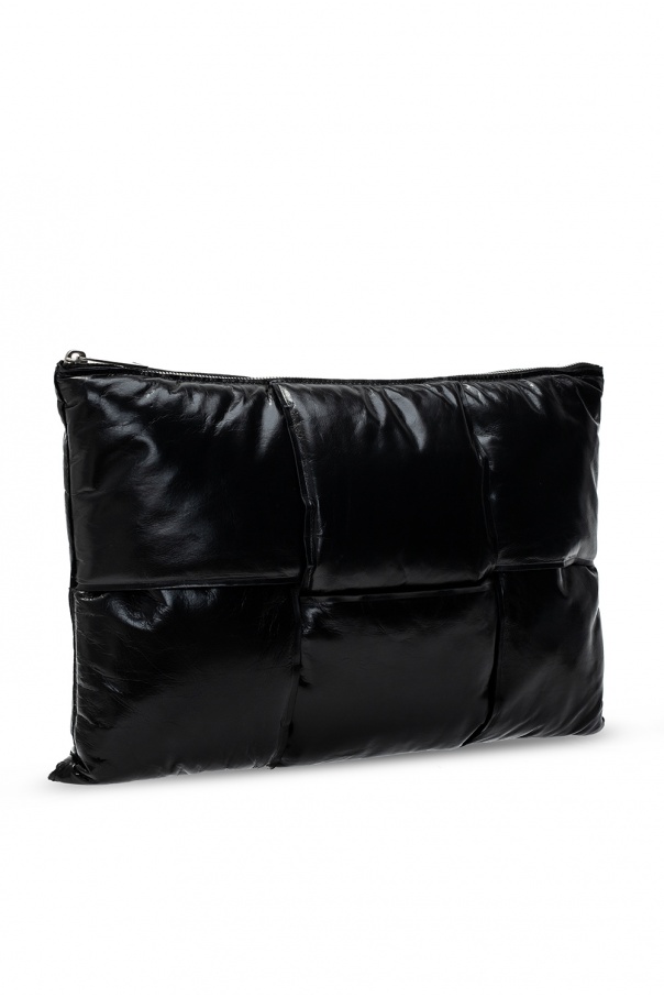 Black 'Pouch' clutch from Bottega Veneta. Crafted calf leather boasting the maxi padded 'Intrecciato' weave which is signature for the label, this design fastens via zip and showcases satin-like finish throughout. It features silver-tone metal hardware and interior with one compartment and one slip pocket.