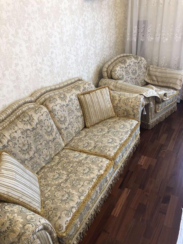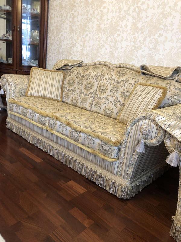 Диван та крісло, комплект. Італія. Виставковий зразок. Дуже гарна тканина: гобелен. Колір - на фото. Всі чохли зйомні: на сидушках, на спинках. На боковини передбачено накидки + 2 невеличкі подушки.