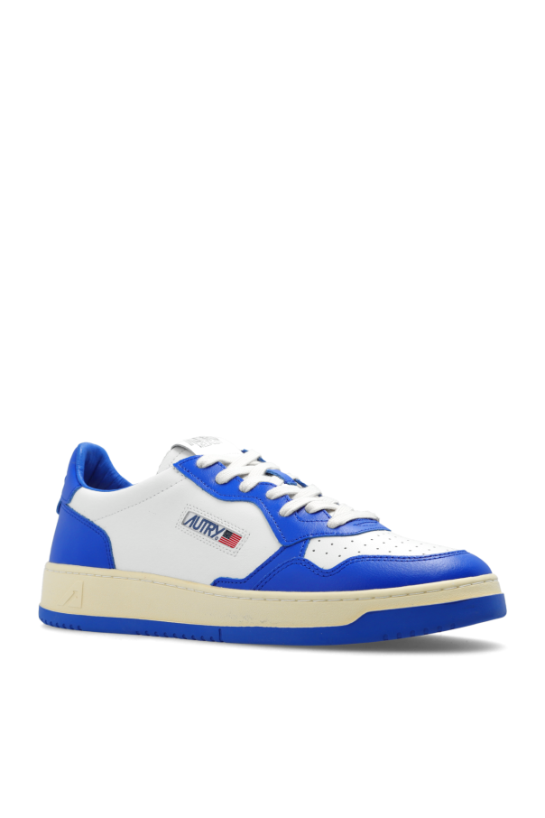 White and blue ‘Medalist’ sneakers from Autry. Made of leather, this lace-up pair sits on a cream and blue rubber sole and features a raw-trimmed tongue, logo and perforations on the front.