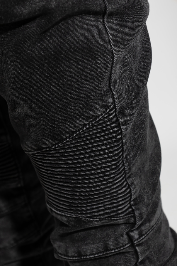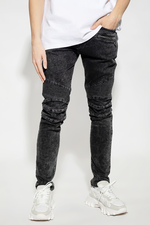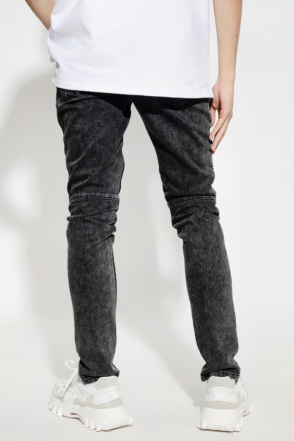 Black slim-fit jeans from Balmain. Falling with tapered legs, this pair showcases distressed detailing, exposed stitching, button fastenings, five slip pockets and two zip pockets on the front and two slip pockets back accompanied a black and white logo patch at the back.