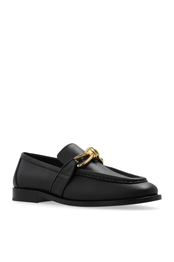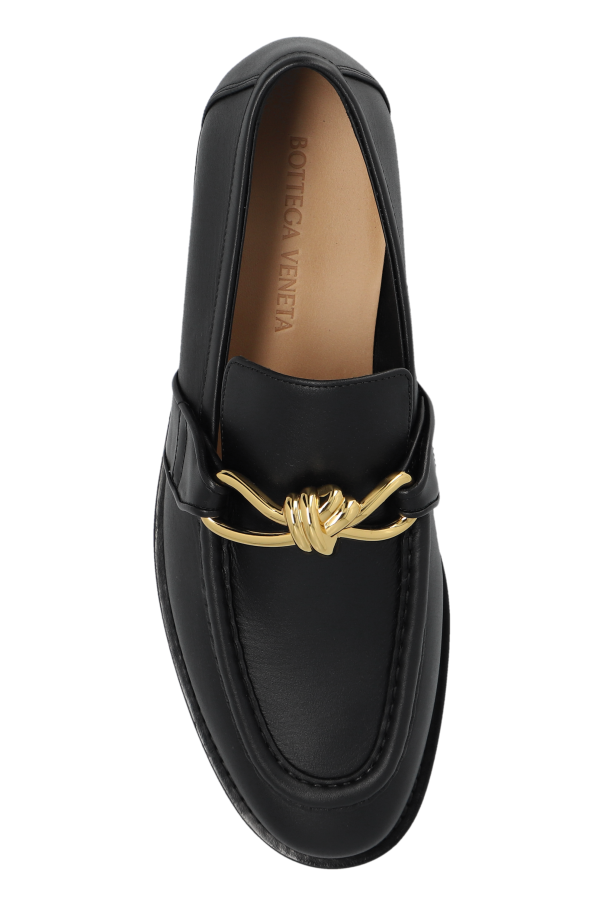 Introducing the Bottega Veneta Astaire Loafers, an embodiment of luxury and refined taste. Crafted from 100% premium smooth leather, these black loafers are a testament to high-quality craftsmanship and enduring style. The loafers' silhouette is accentuated by a distinctive golden chain embellishment, reminiscent of a knotted chain, positioned gracefully on the vamp, adding an element of elegance and visual intrigue. The sleek, rounded toe and flat sole adhere to the classic loafer design, while the internal lining in a light hue offers a striking contrast to the outer leather, enhancing the shoe's aesthetic appeal. The inclusion of the Bottega Veneta name inside the shoe serves as a mark of authenticity and luxury. Each angle and detail of these loafers has been captured in the photographs, providing a comprehensive view of their sophisticated shape and design nuances. Presented on a model, the loafers reveal their potential to elevate any ensemble, seamlessly blending with a variety of styles and occasions. Why Purchase the Bottega Veneta Astaire Loafers? Elegance and Style: The golden chain embellishment adds a unique, refined touch. Premium Quality Material: Made from 100% smooth leather, ensuring durability and comfort. Versatile Design: Perfect for formal events or casual outings, these loafers are a versatile addition to any wardrobe. Exquisite Craftsmanship: From the renowned house of Bottega Veneta, these loafers are a symbol of luxury craftsmanship.