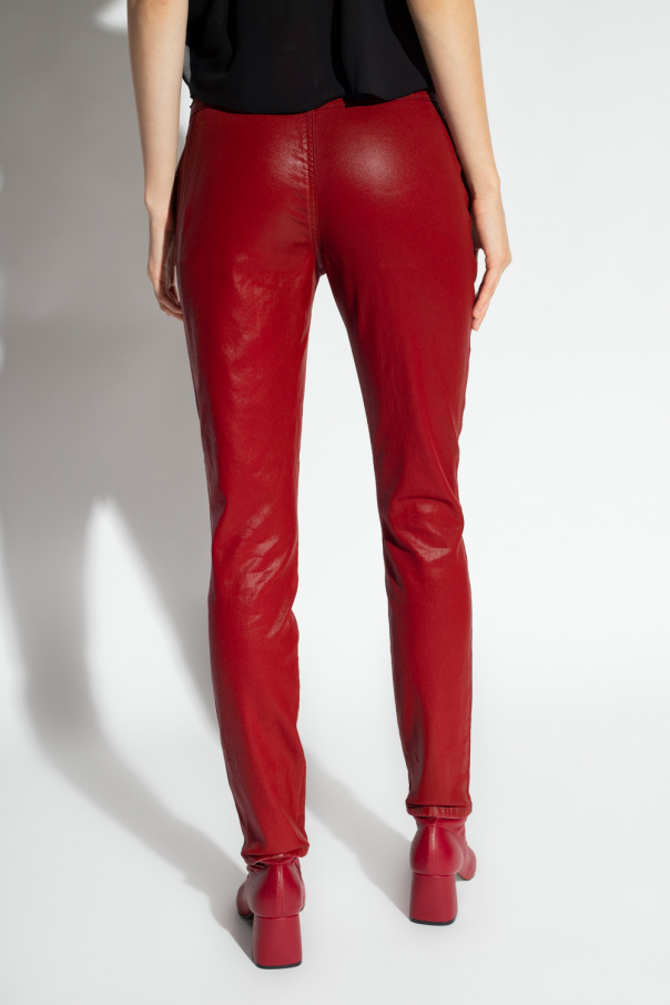 Red ‘D-TAIL’ oversize waxed jeans from Diesel. Fastened with a button and zip, this high-waisted design pair features a logo patch at the back, two slip pocket and tapered legs.