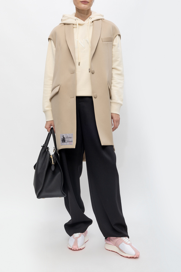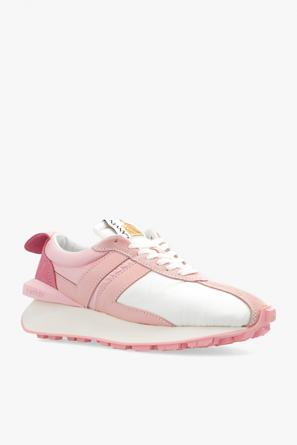 Pink and white ‘Bumpr’ sneakers from Lanvin. Made from leather and fabric, this lace-up model sits on a pink rubber sole and showcases an embossed logo of the brand.