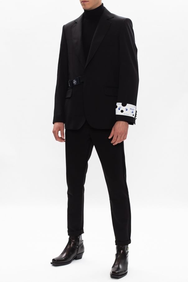 Black blazer from Off-White. Made of wool. Fastened with buttons and a strap decorated with an embroidered and printed logo. Enriched by a black logo embroidery. Two flap pockets and a slip pocket.