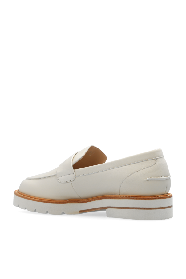 Cream ‘Parker’ loafers from Stuart Weitzman. Made of leather, this model sits on a cream and brown rubber sole.