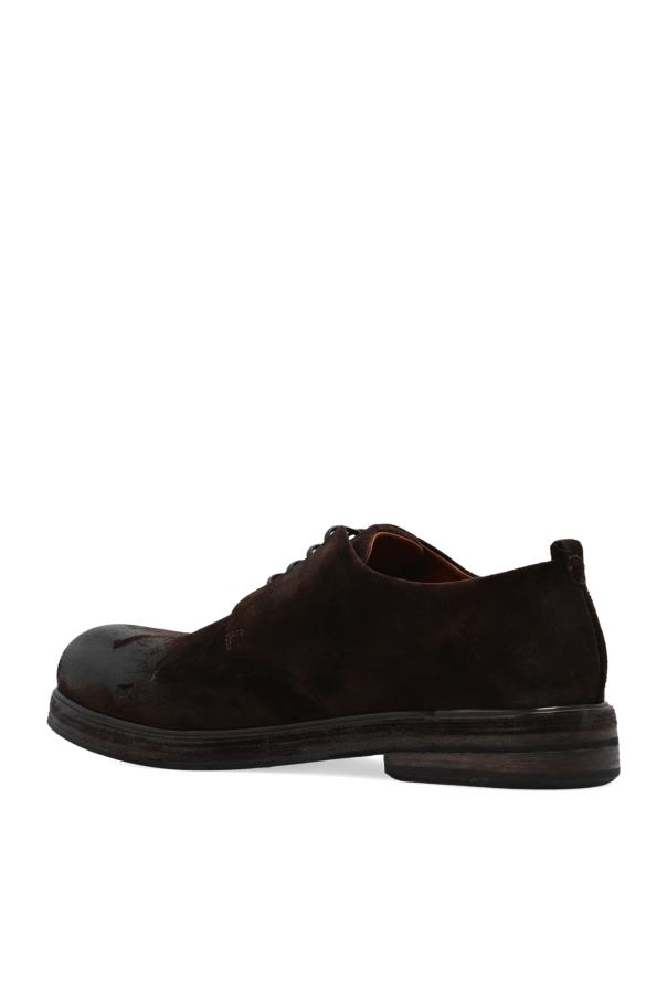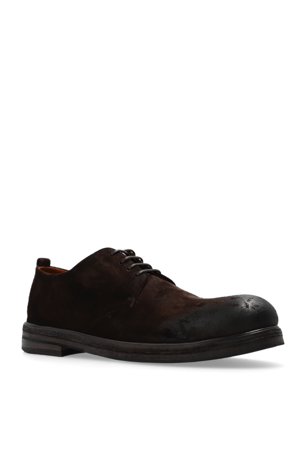 Brown ‘Zucca Zeppa’ Derby shoes from Marsell. Crafted from suede with a vintage effect, this lace-up pair rests on a black rubber-trimmed leather sole.