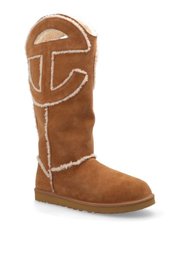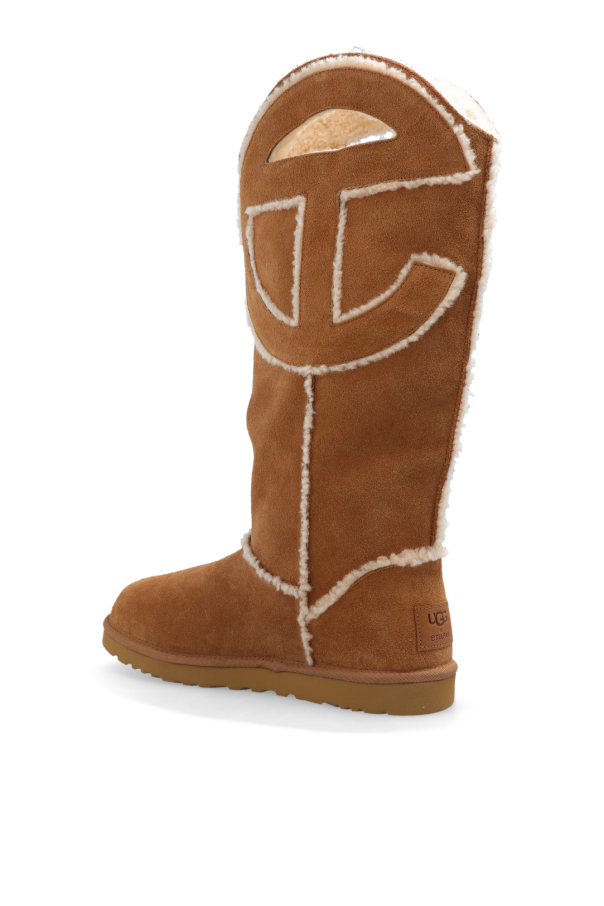 Brown snow boots from UGG x Telfar. Made of suede and lined with UGGPure™, this model sits on a brown rubber sole and features a slip-on silhouette and side pull tabs accompanied by a logo patch.