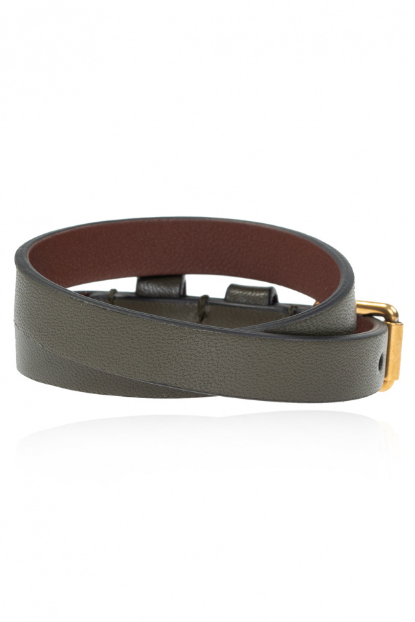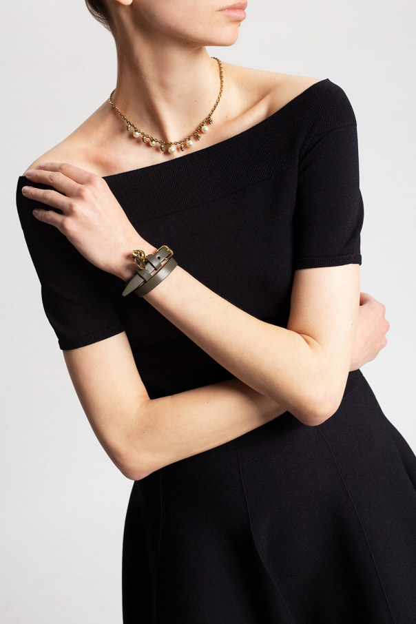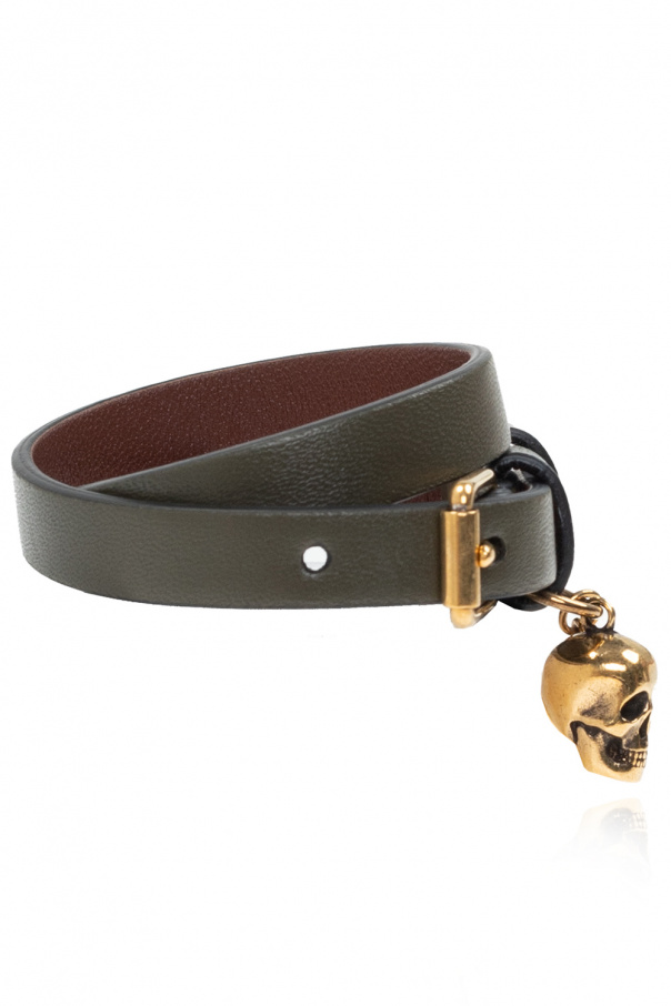 Green and brown double bracelet from Alexander McQueen. Crafted from leather, this design is enriched by gold-tone metal hardware, including a buckle with the brand’s signature skull charm.