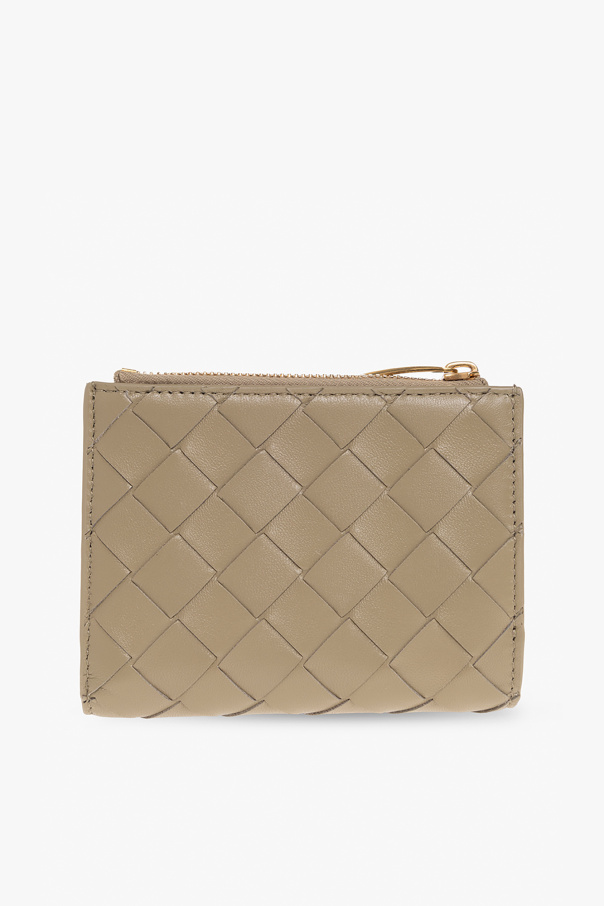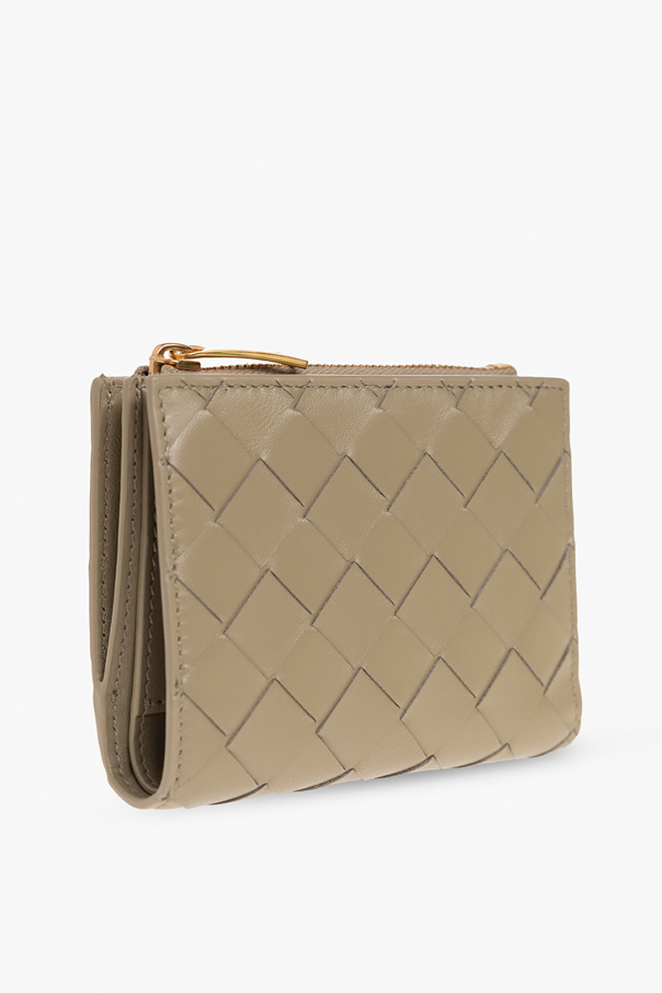 Greenish grey wallet from Bottega Veneta. Crafted from lamb leather with the brand's signature ‘Intreccio’ pattern, this item features a snap fastening, one zip coin pocket, gold-tone metal hardware and one bill compartment, two slip pockets and six card slots inside.