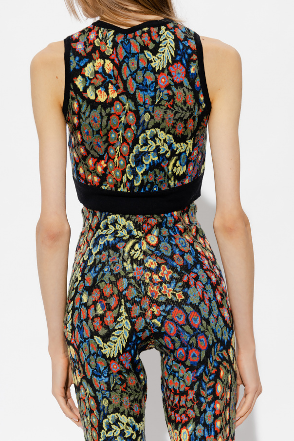 Black sleeveless top from Etro. Crafted from wool, this garment features a multicolored embroidered floral motif and ribbed trims at the crew neck, hem and cuffs.