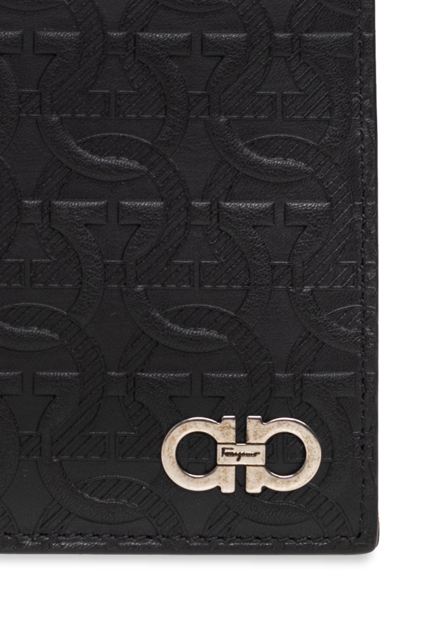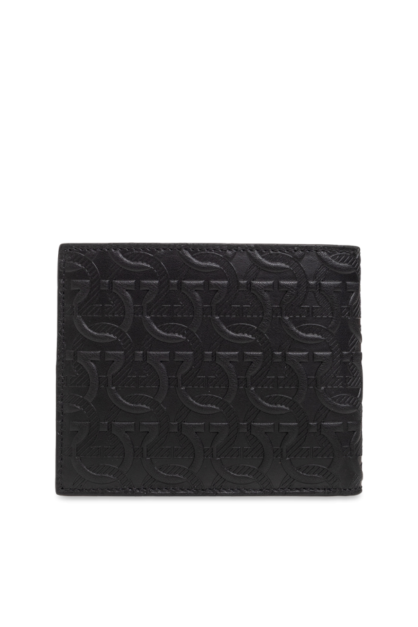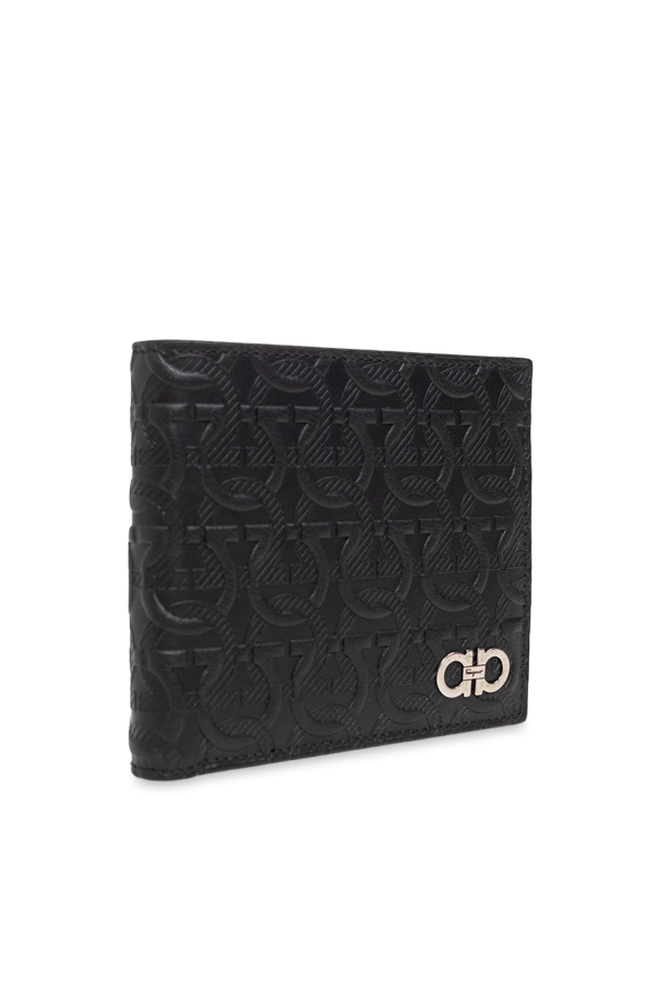 Black bi-fold wallet from FERRAGAMO. Made from leather embossed with the brand's signature Gancini pattern, this design features a silver-tone logo plaque on the front and two bill compartments, four slip pockets and eight card slots inside.