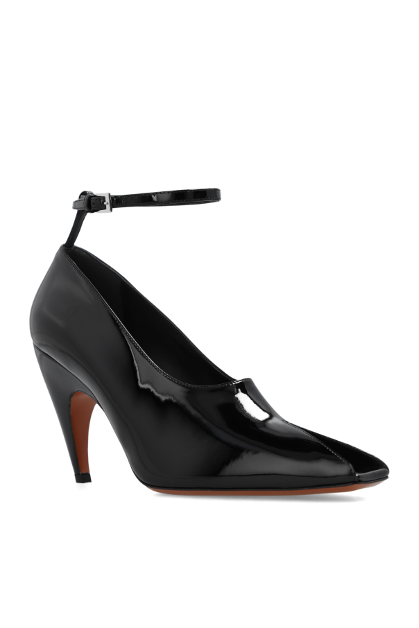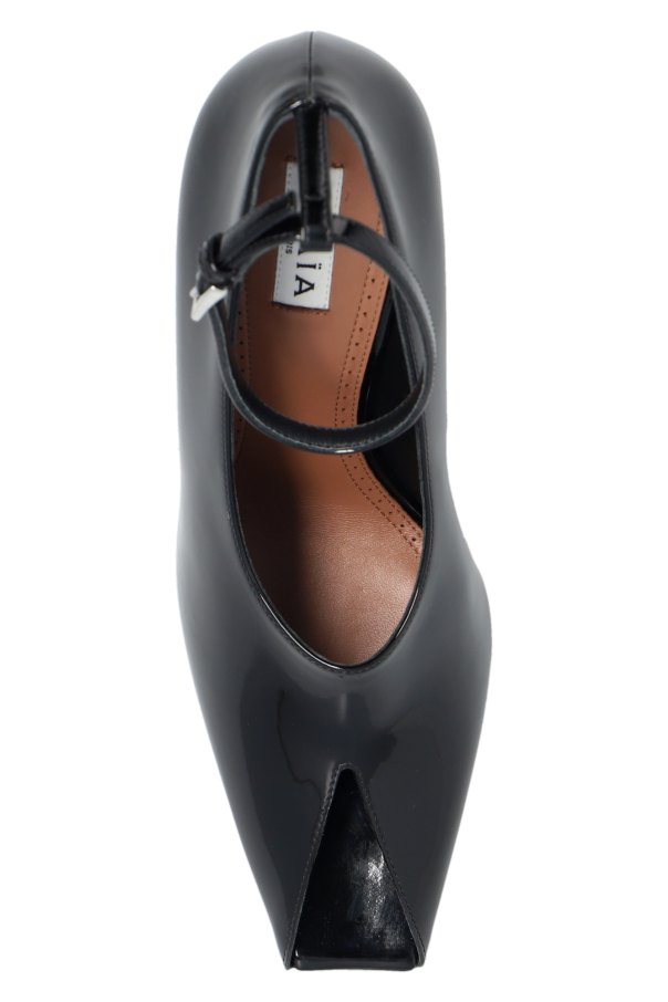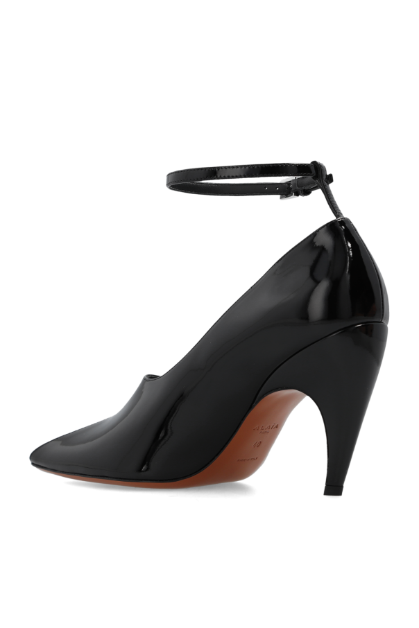 Black pumps from Alaia. Made of leather, this pair features a buckled ankle strap, decorative cut-outs on the front and beige leather sole with rubber anti-slip inserts.