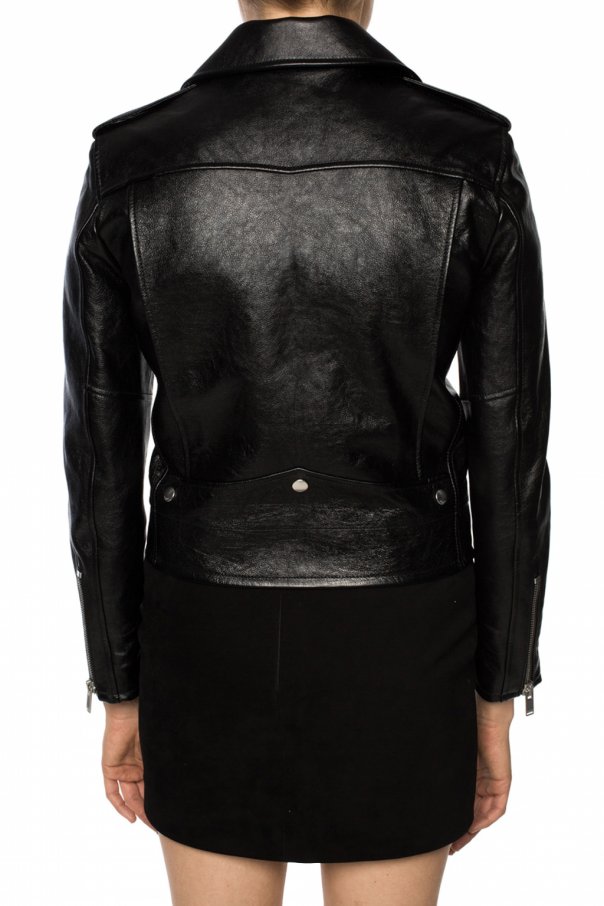 Black biker jacket from Saint Laurent. Made of calf leather. Fastened with zip. 4 pockets at front – 3 feature zip, 1 features snap button. Epaulettes sewn at shoulders. Zip cuffs. Silver-tone metal hardware.