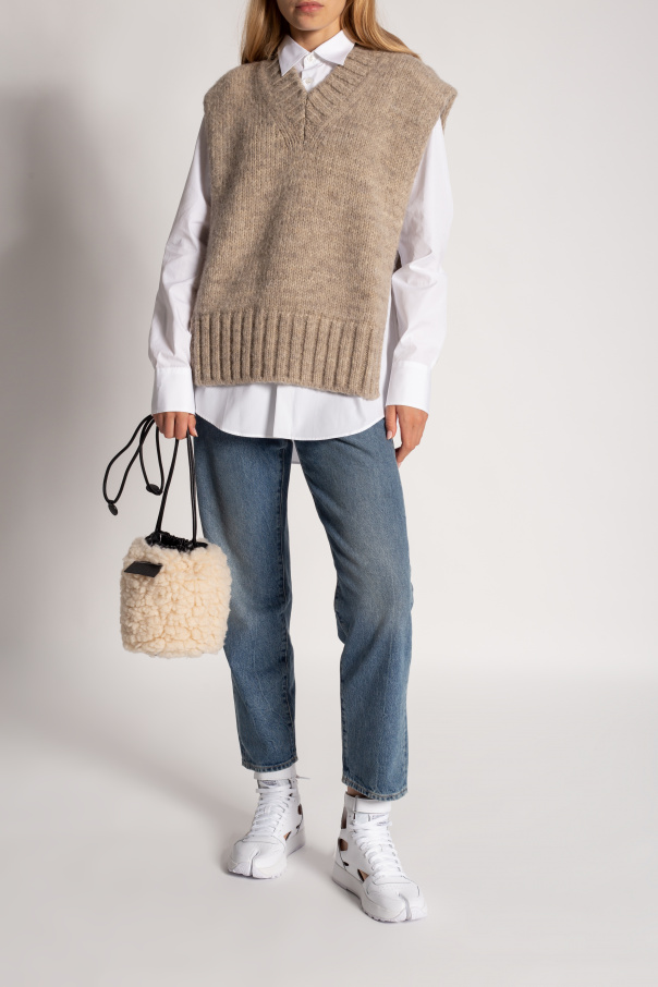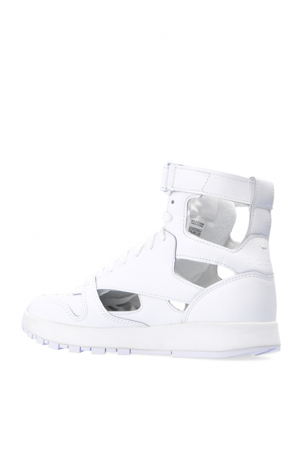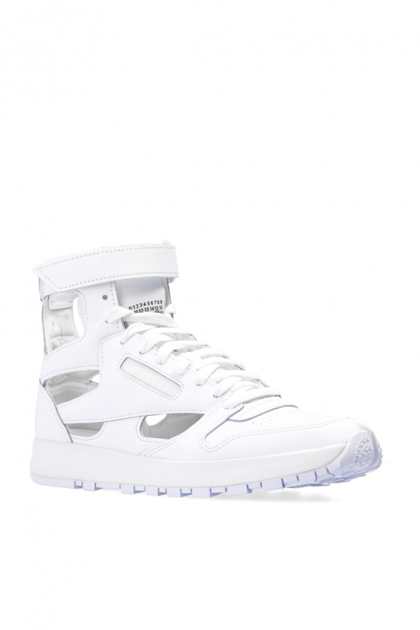 White ‘Project 0 CL GL’ sneakers from Reebok x Maison Margiela. Crafted from leather with the brand's iconic ‘Tabi’ split toe, this lace-up model sits on a white rubber sole and boasts a high-top silhouette, perforations, an additional velcro closure, a branded tongue patch and distinctive cut-outs.