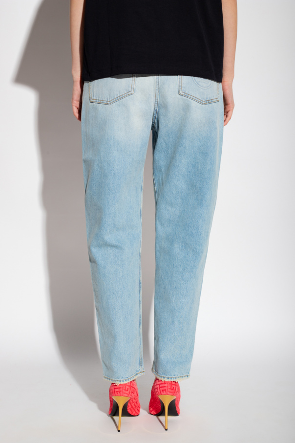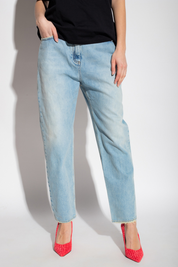 Light blue jeans from Balmain. Falling with slightly tapered legs, this pair features a high-waisted silhouette, zip fly with a button, a vintage effect and classic five pockets – the back one flaunts a logo detail.