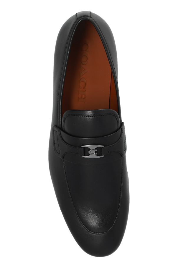 Introducing the pinnacle of sophistication and timeless style: Coach's Black Loafers. Crafted with meticulous attention to detail, these loafers are fashioned from 100% premium, high-gloss leather, ensuring both durability and a luxurious appearance. The sleek, black exterior is complemented by a striking, contrasting interior, a hallmark of distinction that subtly signifies the Coach brand. The loafers' design features a low-cut vamp and a flat sole, embodying the essence of classic elegance, while the absence of laces offers a clean, streamlined silhouette. A distinctive metal buckle adorns the top, adding a touch of elegance and setting these shoes apart as a work of art by renowned designers. These characteristics make the loafers versatile enough to enhance both formal and semi-formal ensembles. Why Purchase This Product? Exceptional Quality: Crafted from high-quality, glossy leather for lasting wear. Elegant Design: The metal buckle adds a sophisticated touch, perfect for upscale occasions. Versatile Style: Easily pairs with a variety of outfits, elevating both formal and semi-formal looks. Signature Detailing: The contrasting interior offers a unique identifier of the Coach brand.